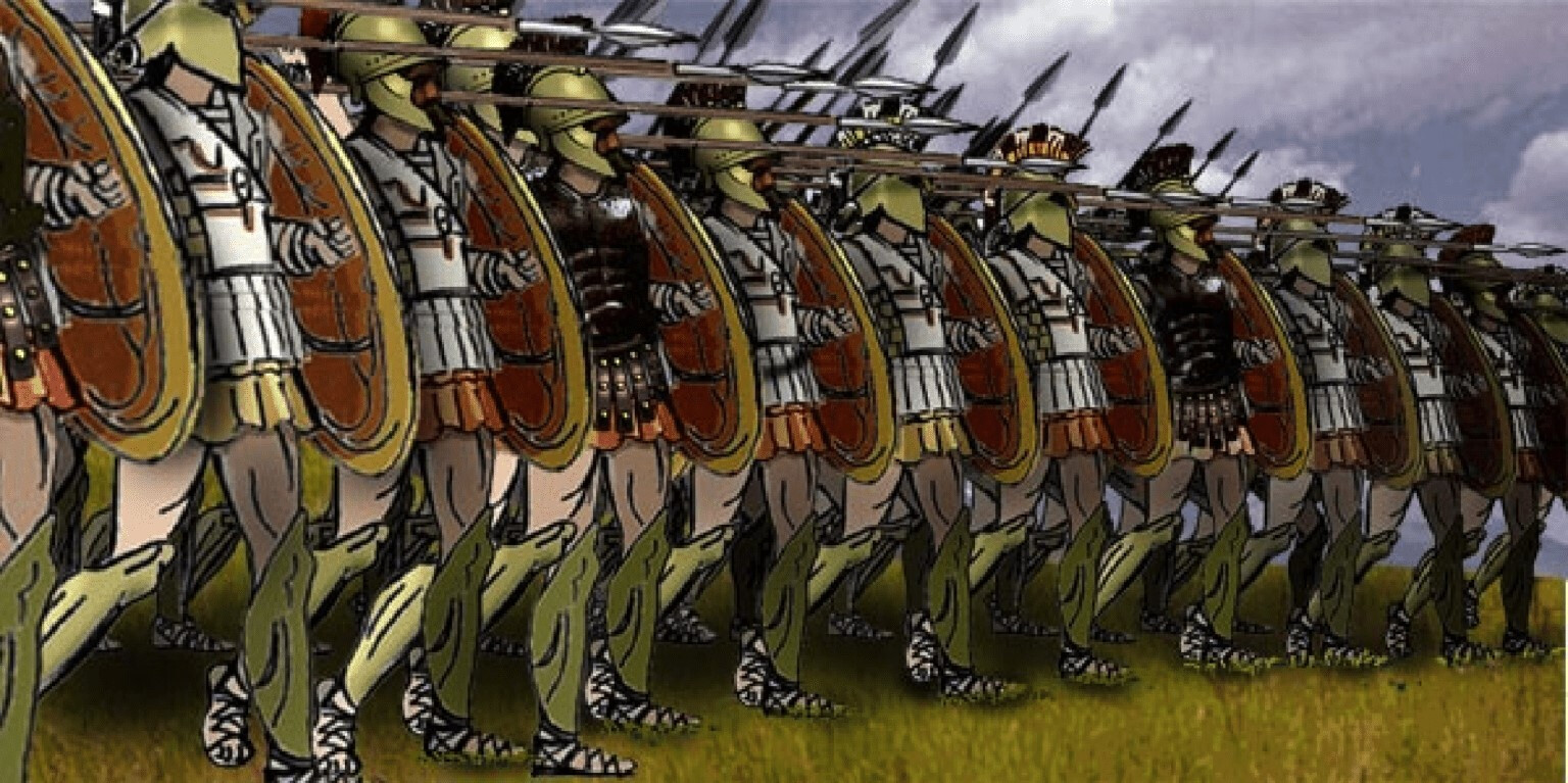 Phalanx is a rectangular mass military formation, usually consisting of heavy infantrymen armed with spears. The phalanx advanced forward at a trot with the battle cry of “Eleleu!” or “Alala”. It looked like a moving wall of shields, above which towered a forest of helmets with fluttering crests. As the two phalanxes neared to within 15 to 20 steps, the hoplites hurled throwing spears into the enemy's ranks. This was followed by an attack with the main spears.