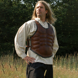 Lighter types of cuirasses became popular, instead. One type of light cuirass was made of metal plates attached to a leather layer, or placed between two layers of fabric, sometimes reinforced in front with metal scales. Another type was made by gluing together several layers of fabric, creating a kind of laminate. This armour was also reinforced with metal plates. It consisted of two pieces, connected to each other by wide shoulder straps, which were tied to metal rings at the front.