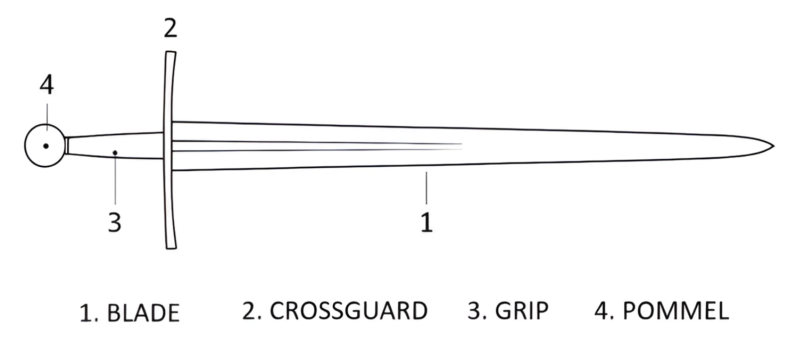 - Sword guard (crossguard) – The metal piece that separates the blade from the grip. It helped block enemy strikes.