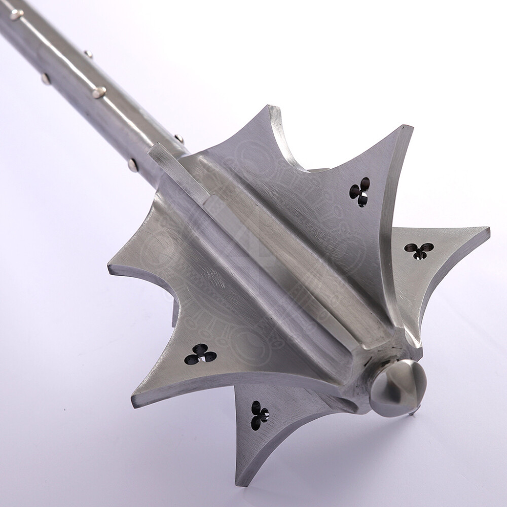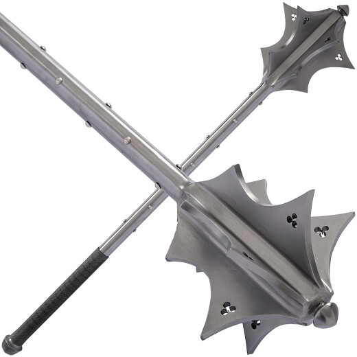 4xThis is a solid and battle ready two-hand-mace that you can take to a live steel combat arena. Its shaft is made of steel rod (not a hollow tube). Its blades are made of thick oil-quenched spring steel. It is simply a heavy-duty and very heavy mace for real and strong warriors that will hold up even in brutal combats. Further product information ...