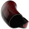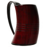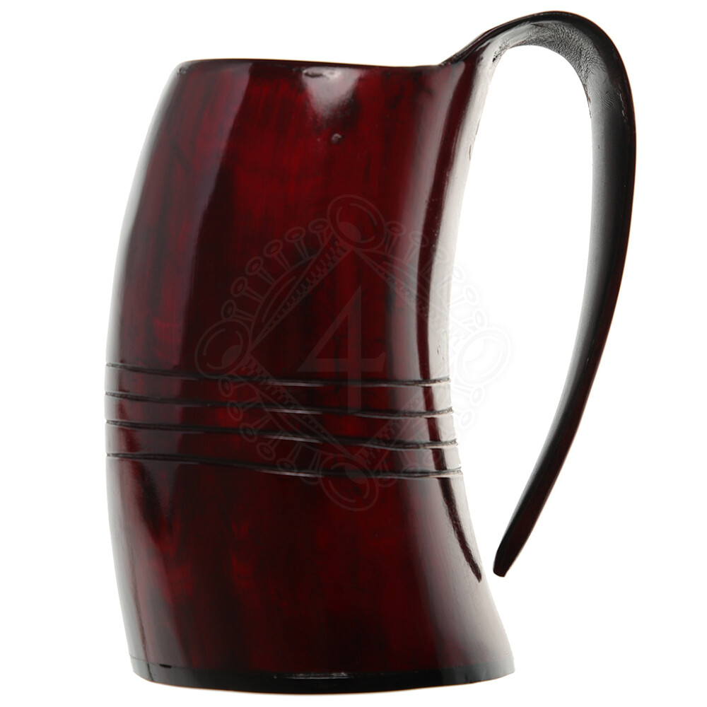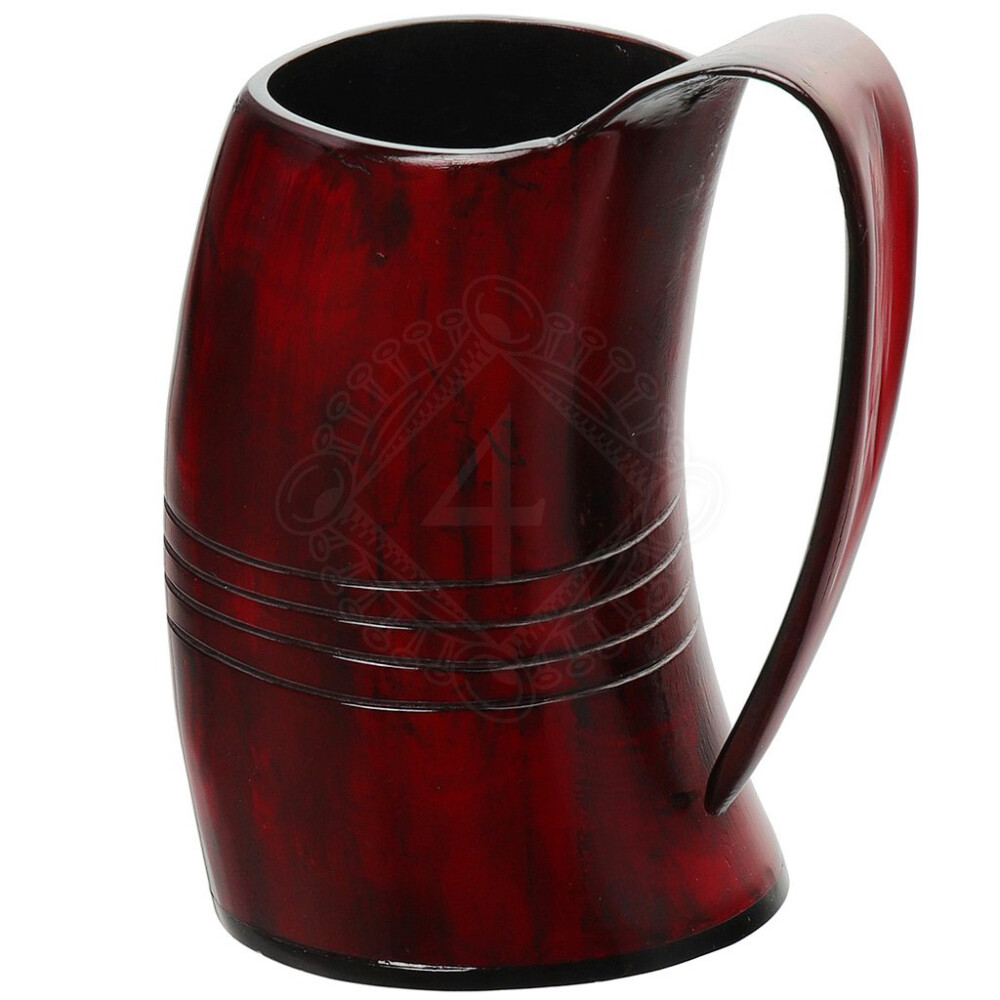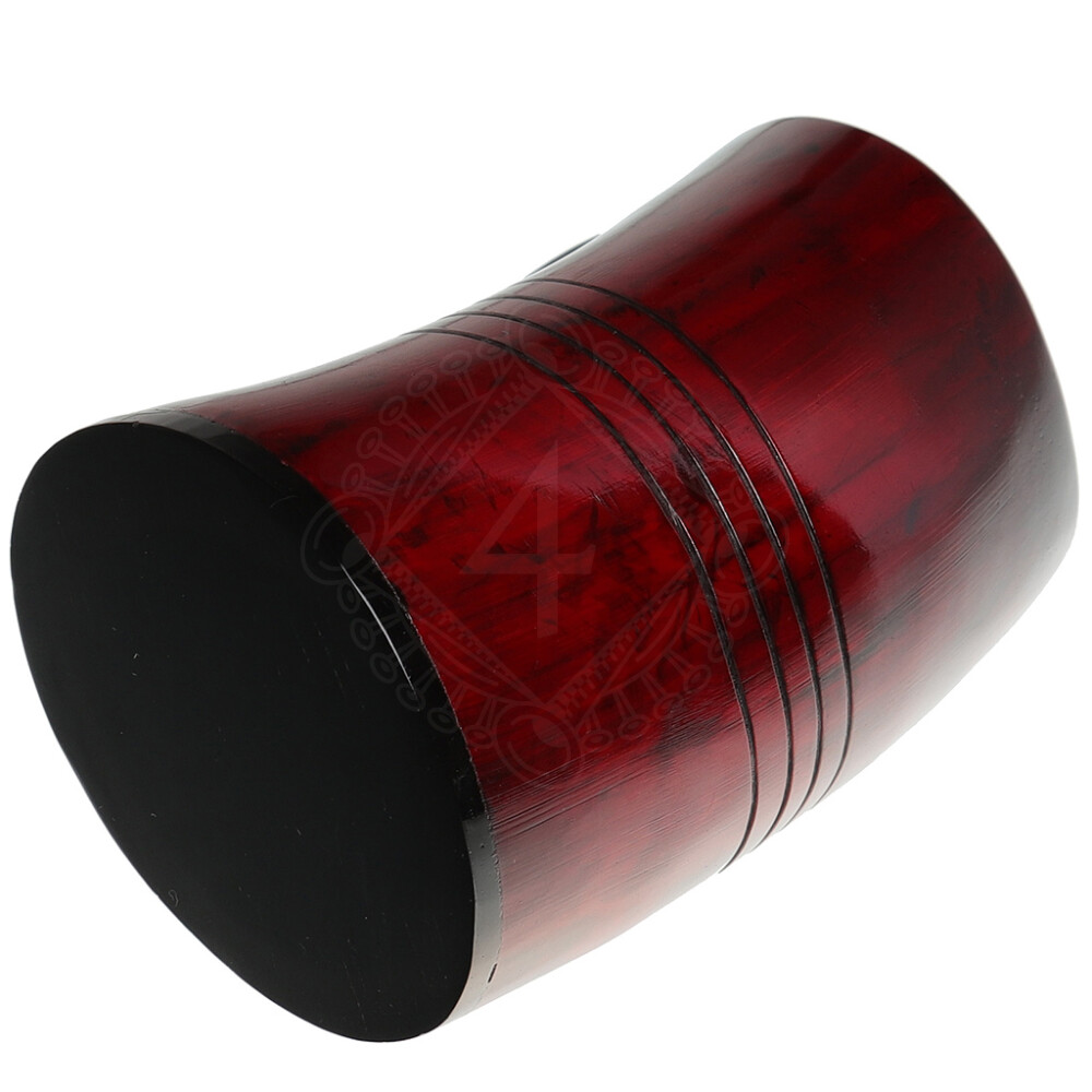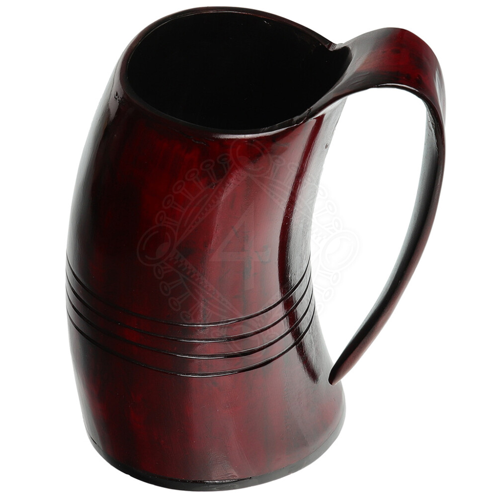 This horn tankard immediately catches the eye with its rich, crimson red colour, through which the natural texture of the material subtly shows. This is not a flat coat of paint, but a deep stain that allows the unique grain of each horn to stand out. The body of the tankard is robust, flaring slightly towards the rim. About halfway up, it is adorned with three elegant, parallel grooves that not only improve grip but also add a touch of sophistication. The handle is cleverly formed from the naturally tapering tip of the horn, seamlessly integrated with the body for a comfortable and secure hold. The tankard rests on a solid, black, flat resin bottom, ensuring perfect stability on any table.