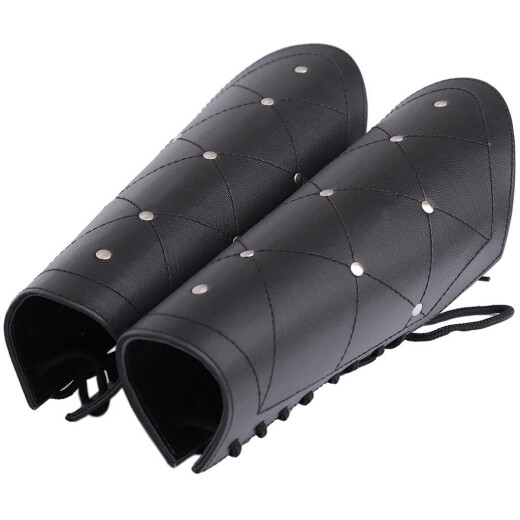 A detailed look at these bracers reveals their robust construction from strong faux leather (PU). The outer side features decorative diamond quilting, which not only looks great but also slightly reinforces the entire structure. Shiny metal studs are placed at the intersections of the stitching, giving the armour a rugged and combative appearance.