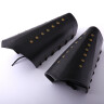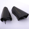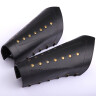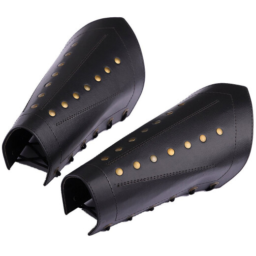 These greaves are around 36cm long and made of genuine leather with a robust thickness of almost 5mm. The riveting and the eyelets for the lacing on the underside are made of metal.