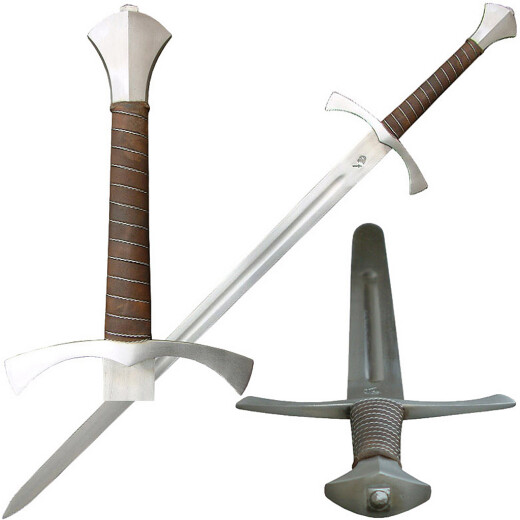 The 22 cm wide steel guard corresponds to Oakeshott Style 7—its arms are sharply curved towards the blade, providing excellent hand protection. The long grip (20.5 cm) allows for a comfortable one or two-handed hold. Its wooden core is covered with quality leather and reinforced with a spiral wire wrap, ensuring a secure grip even while wearing gloves. The impressive ensemble is completed by a massive steel "fishtail" pommel, classified as Oakeshott Type V, which perfectly balances the sword. The point of balance is located a mere 3 cm from the guard, guaranteeing superb maneuverability.