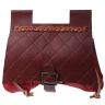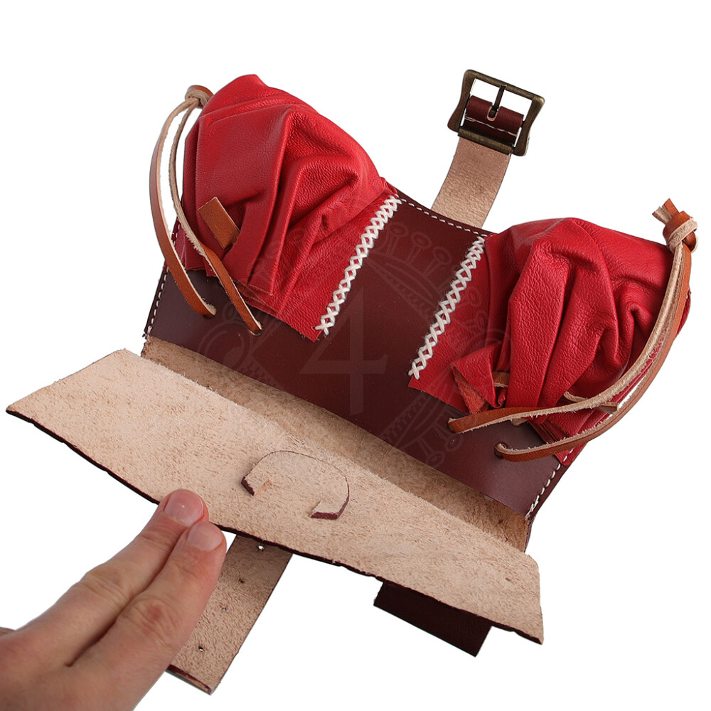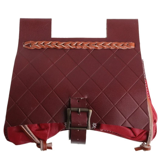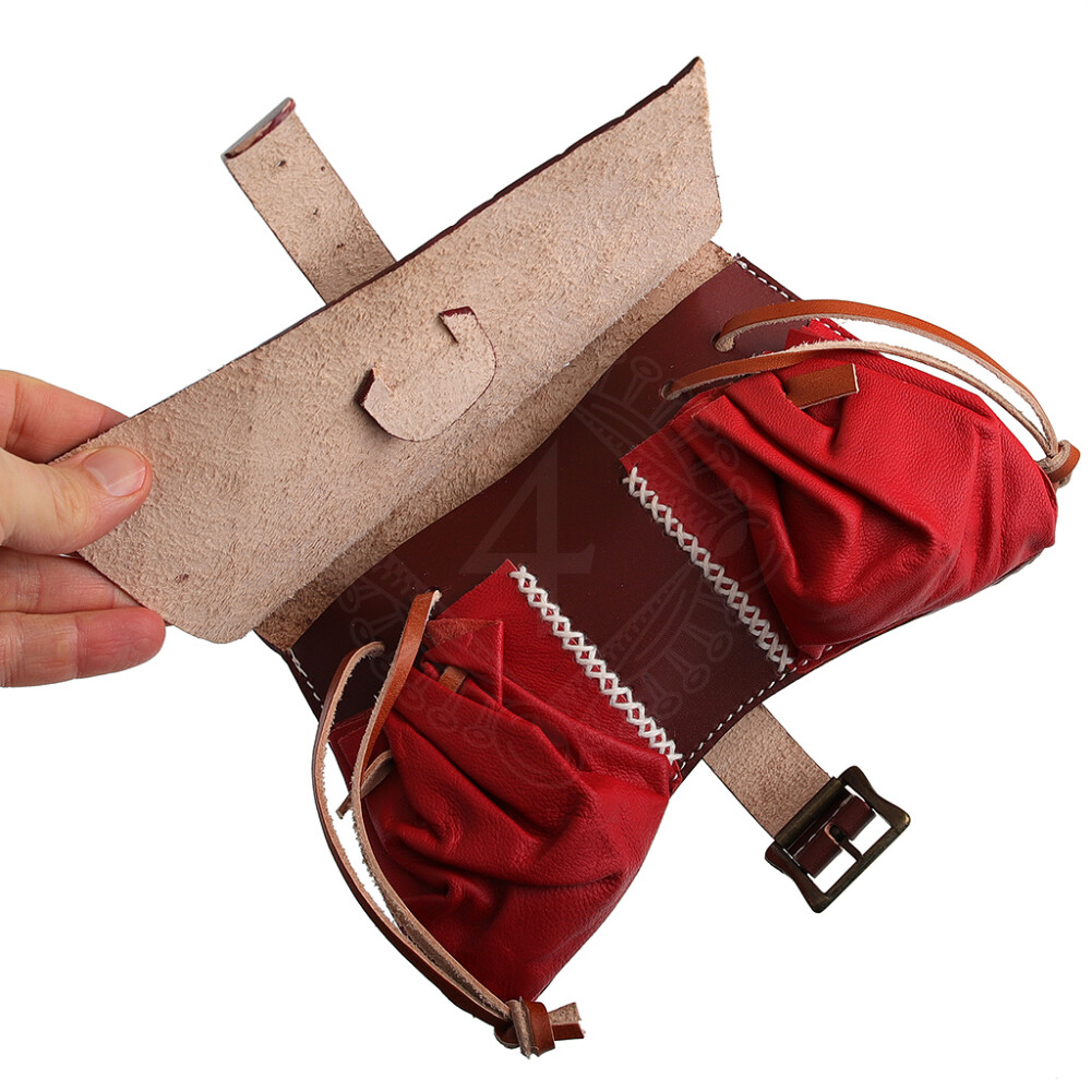 The bag is made from sturdy cowhide leather. The main structure, including the back panel and the covering flap (approx. 20.4 cm wide), is finished in a rich brown colour, while the two striking front pouches, attached with elegant cross-stitching, are made from softer leather in a vibrant red hue. This two-tone design gives the bag a distinctive and attractive appearance. The main pocket behind the pouches provides space for larger items. The two smaller pouches, perfect for coins, keys, or other small bits, close with practical leather drawstrings. The entire bag fastens securely with an approx. 21 mm wide and 2 mm thick leather strap and a robust brass buckle. Integrated into the upper part, directly from the main leather piece, are loops for threading onto a belt up to 30 mm wide.