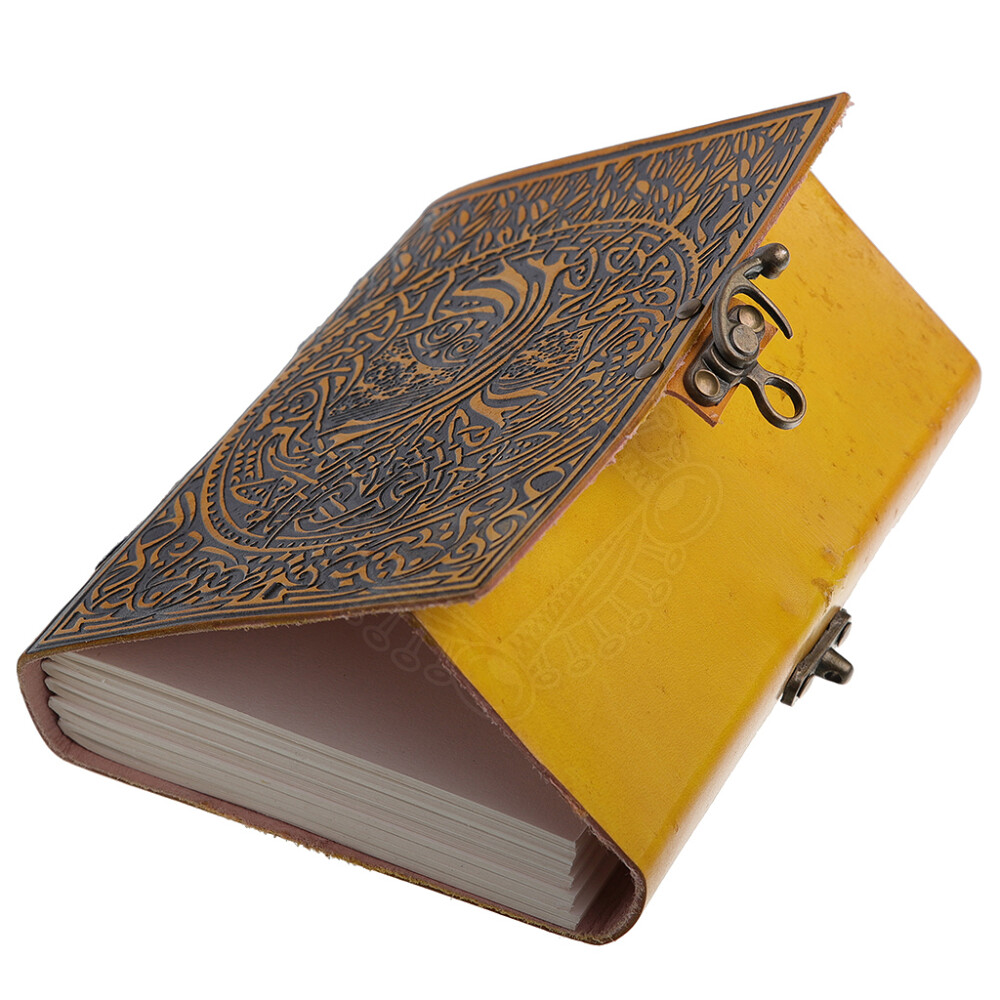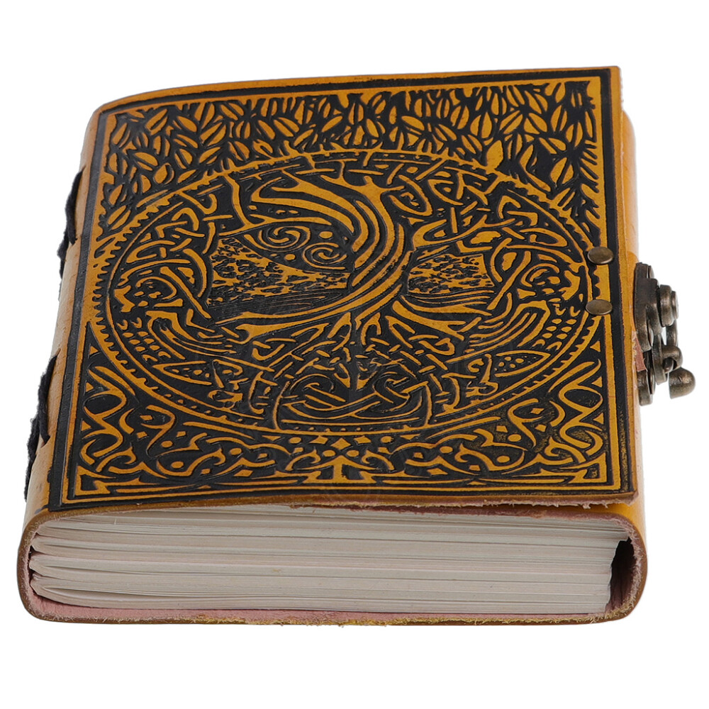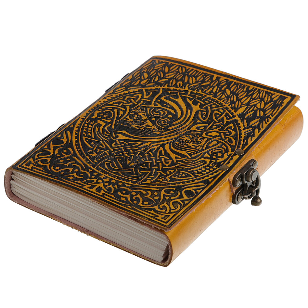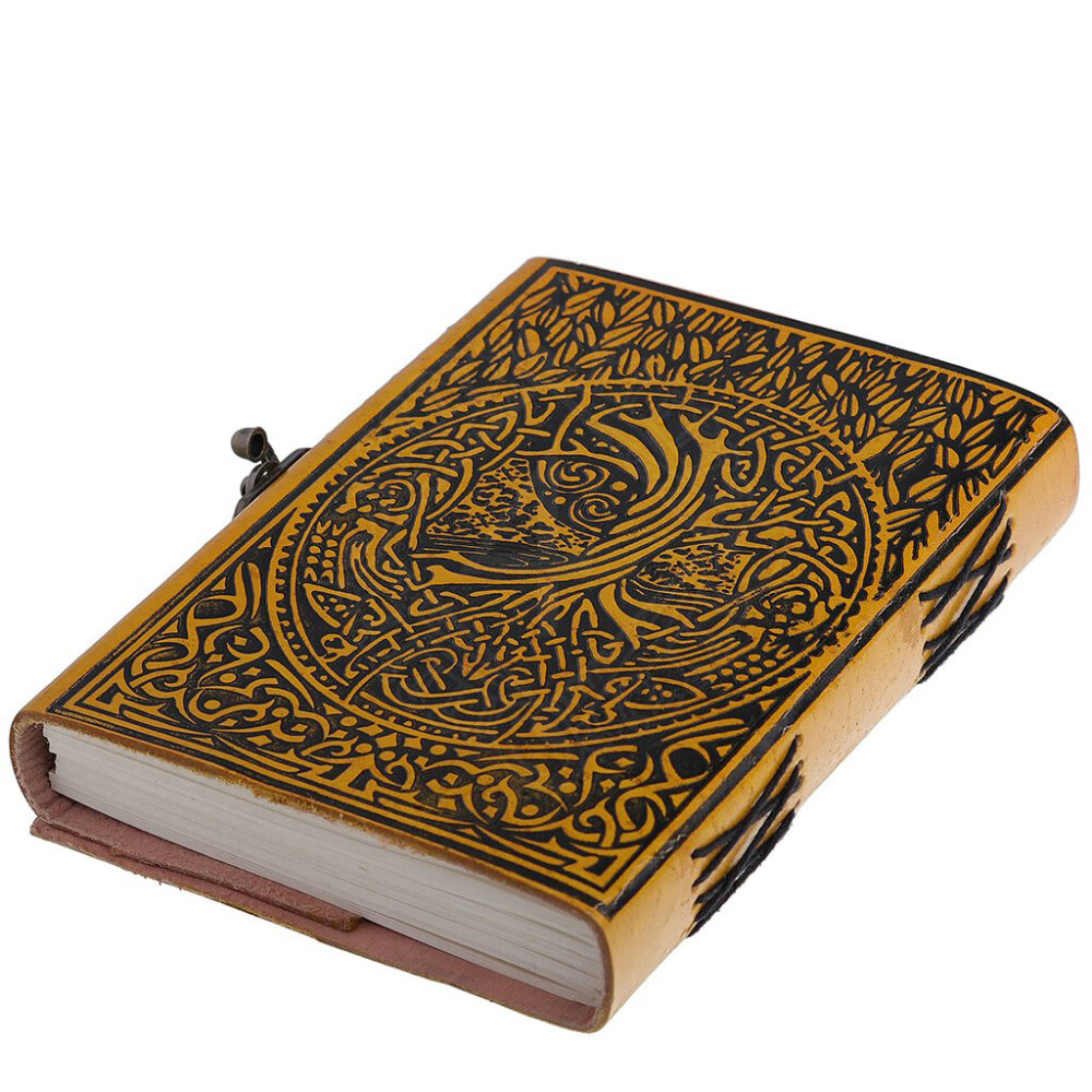 Awaken the ancient wisdom within and chronicle your thoughts in this unique leather journal. Its striking yellow cover features a detailed embossing of the Norse Tree of Life, Yggdrasil, highlighted with a contrasting black finish. This is more than just a notebook; it's a powerful artifact destined to guard your ideas, dreams, and stories. A metal clasp on the side of the book ensures your secrets remain securely guarded. Further product information ...