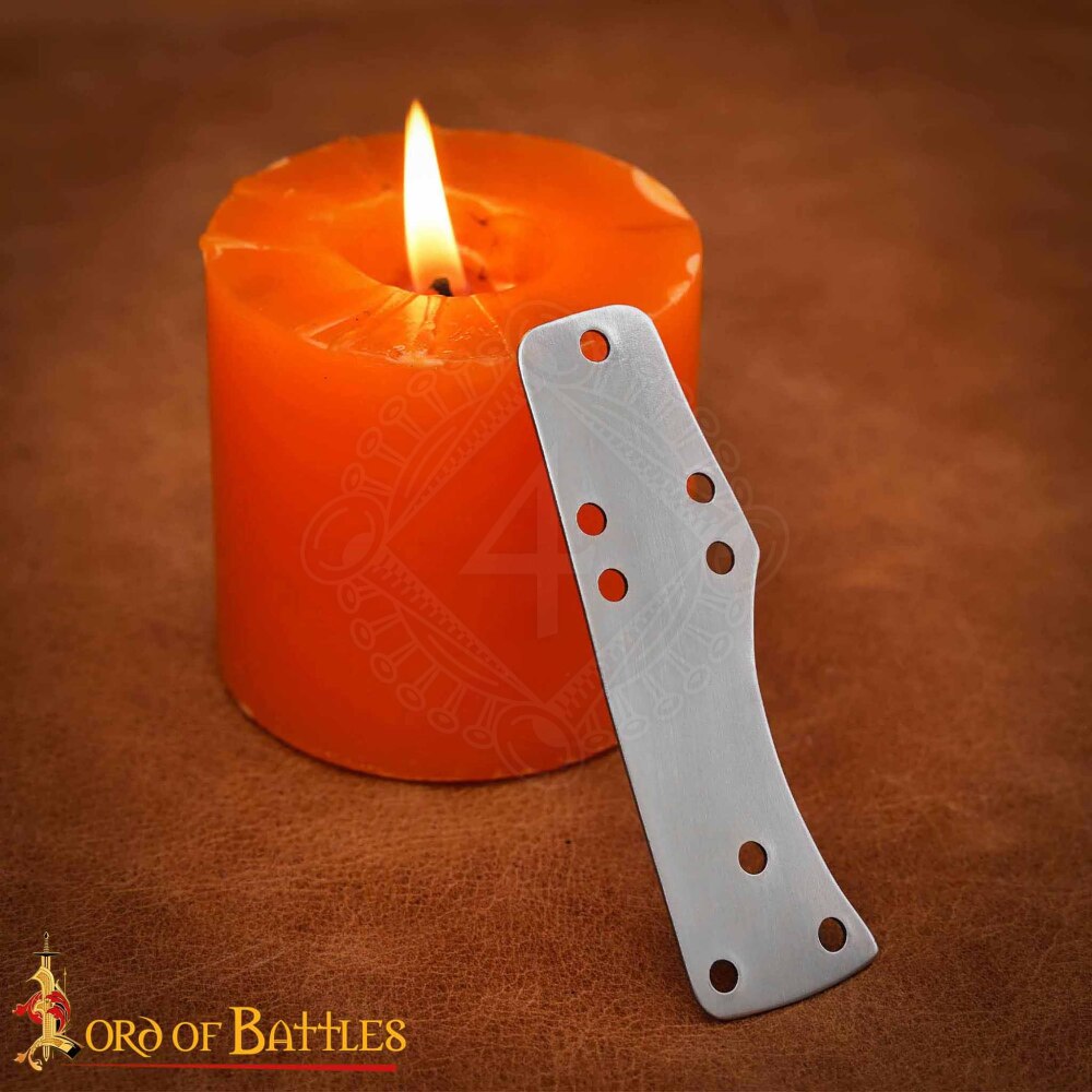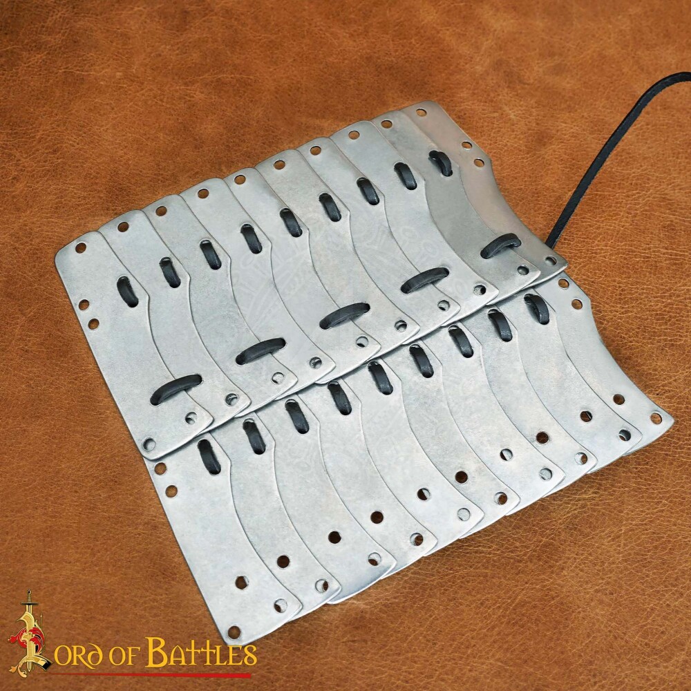 For the best results, we recommend thoroughly degreasing the lamellae before you begin. For lacing, use a strong material like 2-3 mm leather cord or waxed linen thread. If you wish to permanently protect the armour from rust, you can paint the plates or blacken them in oil before assembly. If you leave them in their raw steel state, remember to treat them regularly with a protective oil after use.