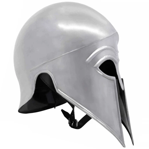 This Corinthian helmet is precisely crafted from approximately 1mm (around 20 gauge) mild steel, giving it the necessary robustness. Its iconic shape completely covers the head and neck, leaving the characteristic almond-shaped eye openings and a clear space for breathing beneath the prominent nose guard. The edges of the helmet are carefully finished and riveted. The inside of the helmet is painted black for protection and a period look. For your maximum comfort, the helmet is equipped with a high-quality, adjustable inner liner made of genuine leather and a sturdy leather chin strap with a brass buckle for a secure fit.