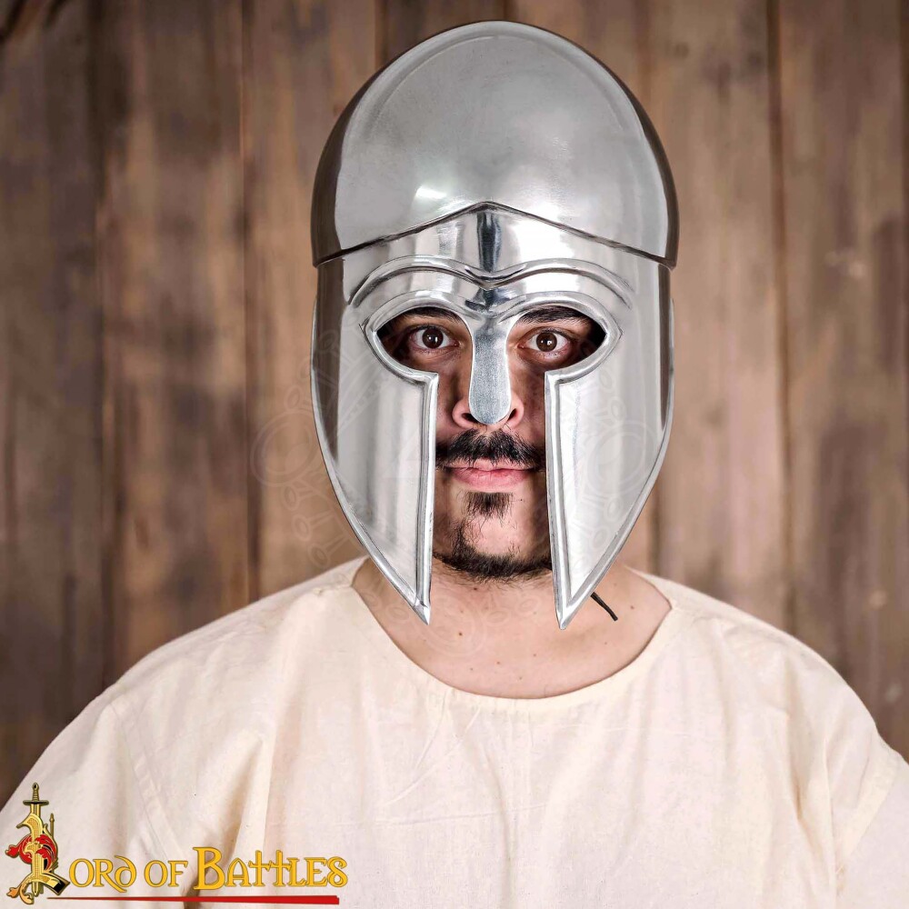 Step into the world of ancient heroes with this authentic replica of the Greek Corinthian helmet! Handcrafted from steel, this helmet is not just a piece of protective gear but also a tribute to the legendary hoplites of the Archaic and Early Classical periods. Thanks to its high-quality, adjustable leather liner and characteristic design, it's perfect for cosplay, reenactment, collectors, or as a unique decorative piece that will bring the spirit of ancient Greece right into your home. This quality product by Lord Of Battles® will transport you directly to the battlefields of antiquity. Further product information ...