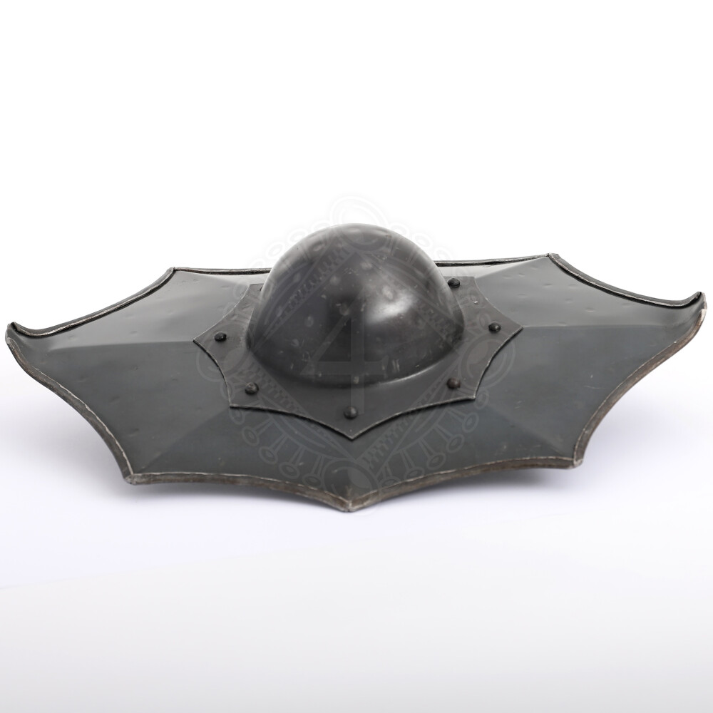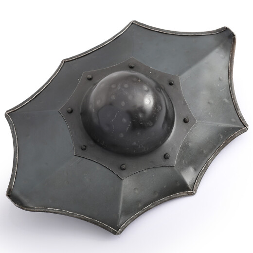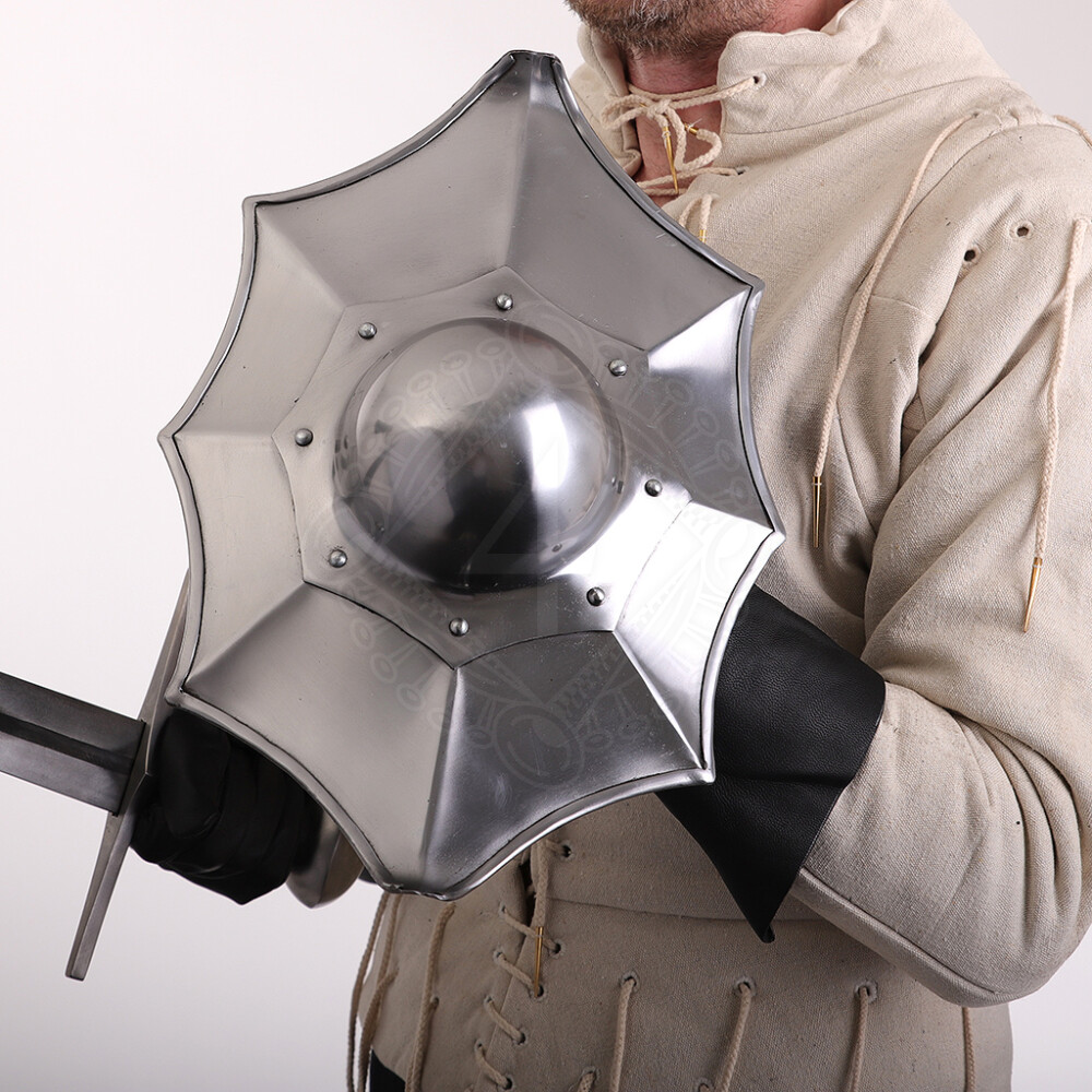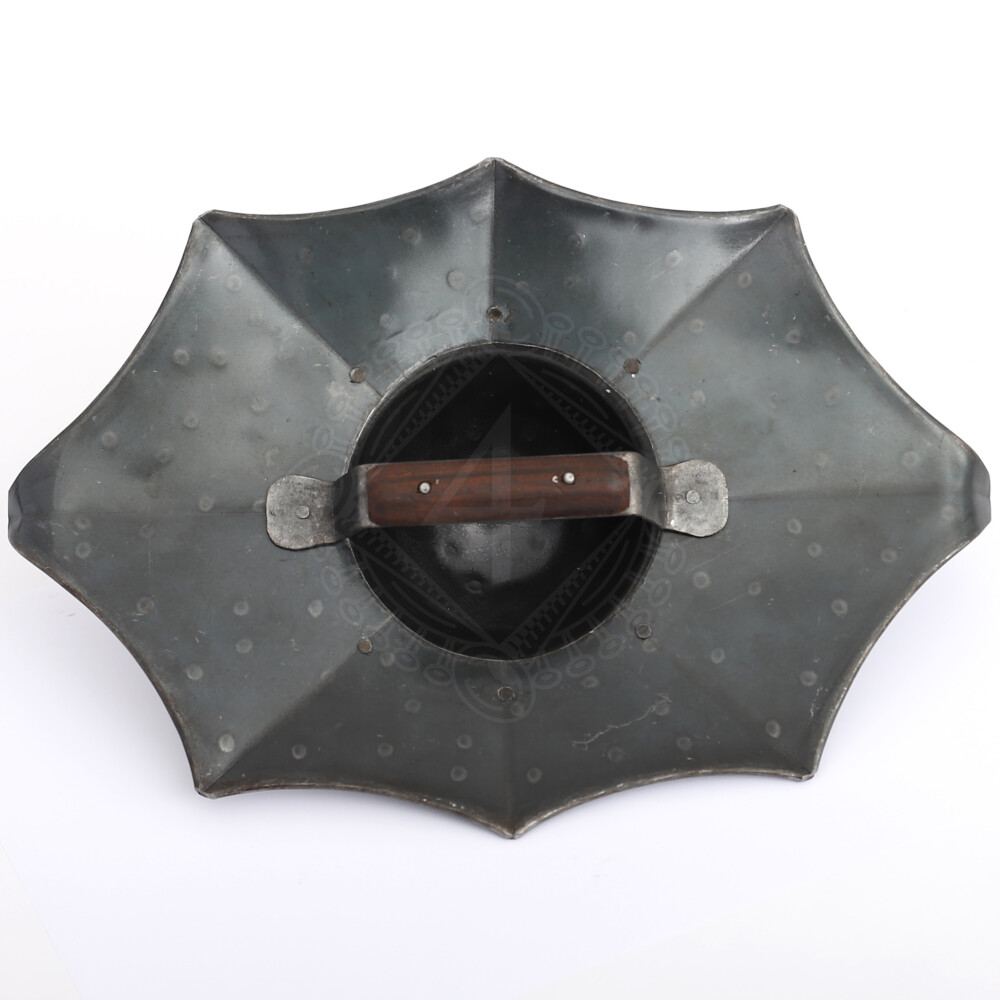 This buckler, faithful to the illustrations in Talhoffer's fencing manuals, boasts a unique eight-pointed construction. It is cleverly crafted from 1.6 mm (16-gauge) steel plate, but the central, deep boss, which absorbs the most impact, is reinforced to an exceptionally durable 2.0 mm (14-gauge). This combination ensures excellent strength while maintaining a manageable weight. The individual lobes and points are designed to concentrate the force of a blow into a small area. A sturdy, all-steel D-shaped handle is welded firmly to the back, guaranteeing an uncompromising grip.