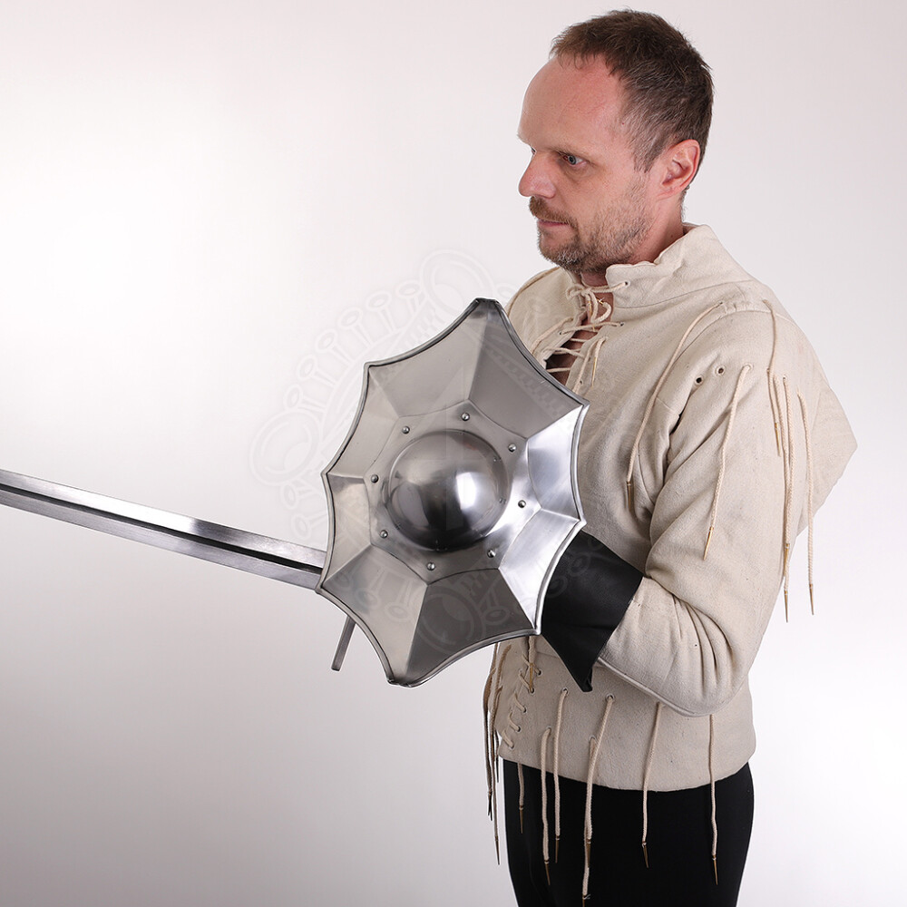 2xEnter the arena with a buckler that bears the name of one of the greatest fencing masters in history—Hans Talhoffer. This is no ordinary fist-shield. Its aggressive, eight-lobed design with sharp points is not merely for show; it is a direct reference to the brutally effective combat techniques of the 15th century. Every detail is designed for active combat—for parrying, binding, and above all, for unexpected offensive actions that can turn the tide of a duel. Further product information ...