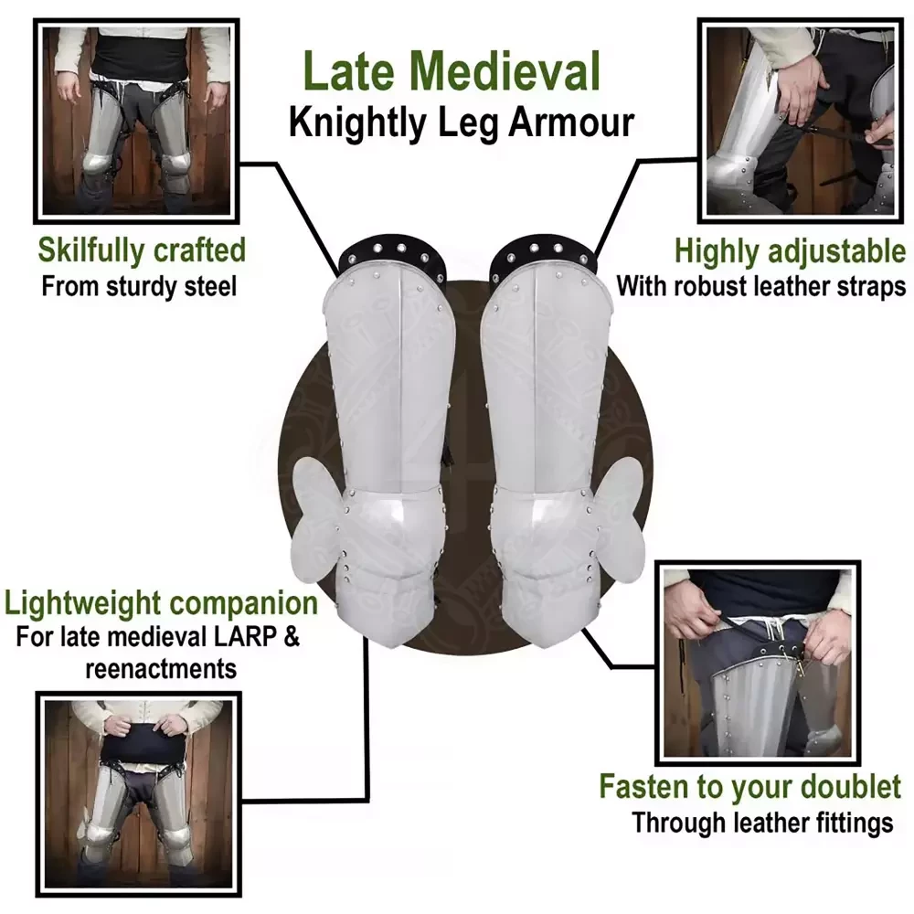 To ensure the armour doesn't slip, it features a thoughtful fastening system: * Leather Straps: Three pairs of robust genuine leather straps with brass buckles wrap around the leg at the thigh, below the knee, and around the calf. * Lacing (Pointing): The upper leather tab of the thigh plate has holes for tying (pointing) the armour to a belt (arming belt) or a doublet (pourpoint). This point is crucial – without being tied to a belt/garment, the leg armour will slide down!