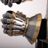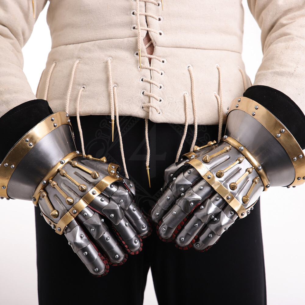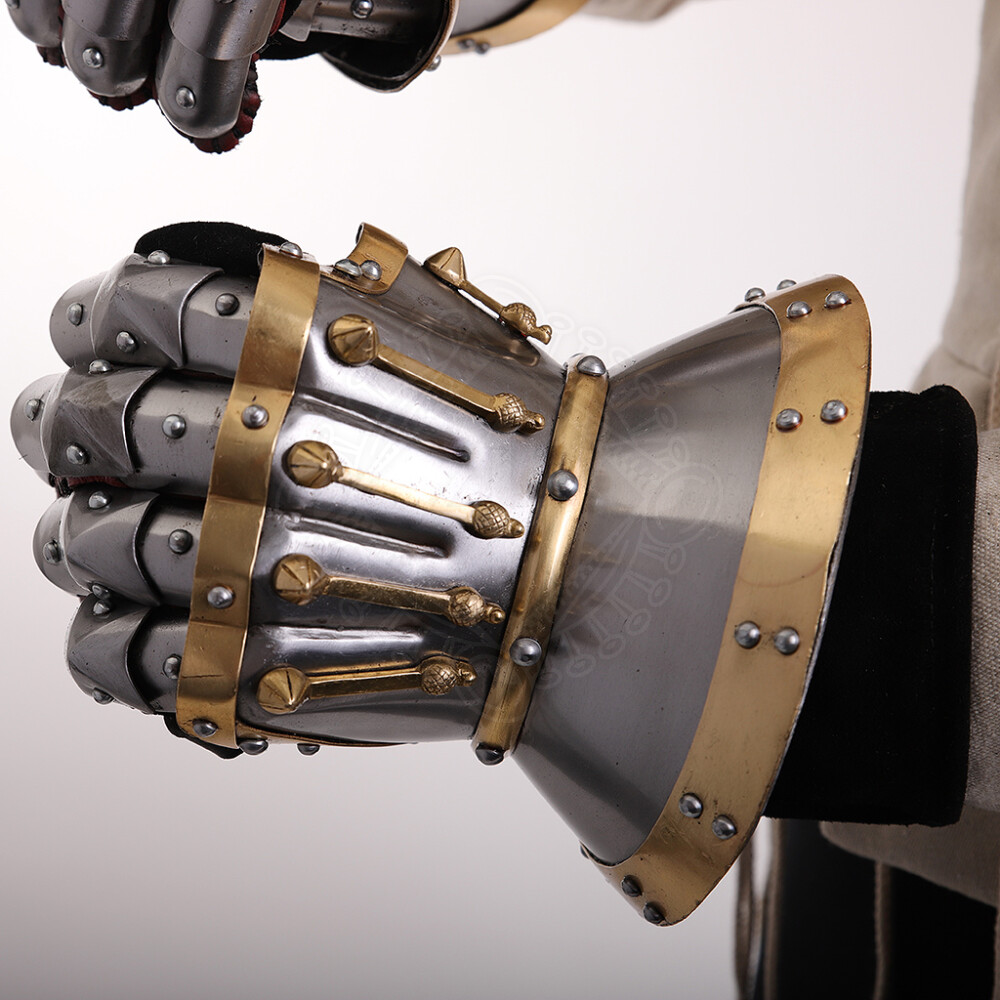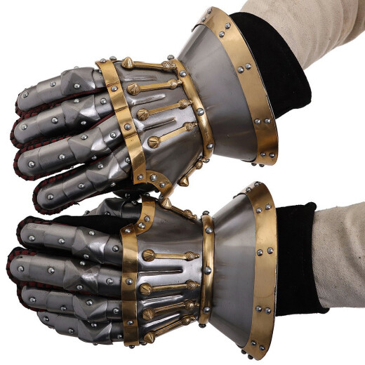 Transport yourself to the tournaments and battles of the Late Middle Ages with these masterfully crafted plate gauntlets. This type, known as the "hourglass" style due to its shape, is an icon of 14th-century armouring. Our replica faithfully mimics the style of the famous Milanese armourers, whose works adorn collections such as that of Churburg Castle. The combination of polished steel and brass details makes them not only functional protection but also a true jewel of your armour. Made from sturdy 1.6 mm (16 gauge) steel and equipped with a sewn-in suede glove, they offer maximum comfort and a secure grip on your weapon. Further product information ...