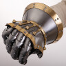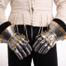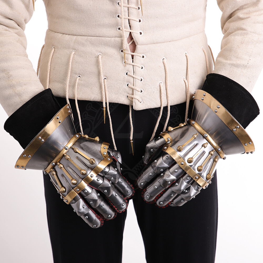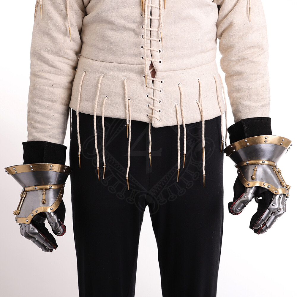 The hourglass shape is not merely aesthetic. The flared cuff protects the wrist without restricting its rotation – a key feature for effective sword fencing or handling polearms. * Protection: Each finger joint is protected by a separate steel segment securely riveted to the leather base. The back of the hand is covered by a massive plate reinforced with a brass rim. * Aesthetics: Brass elements on the knuckles and cuff edges give the gauntlets the appearance of armour fit for a nobleman or a wealthy mercenary. * Comfort: Inside, a soft yet durable suede leather glove is firmly stitched in, cushioning impacts and preventing chafing.