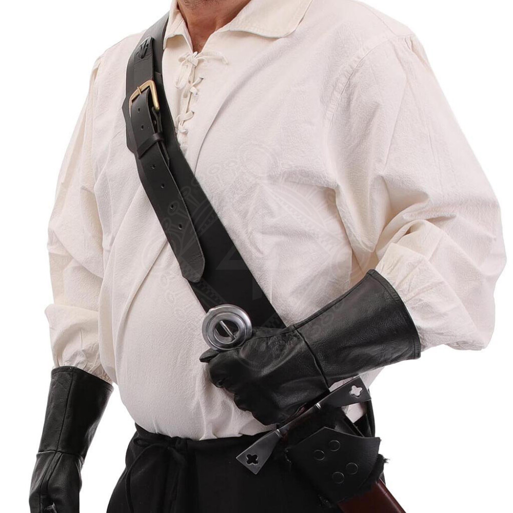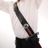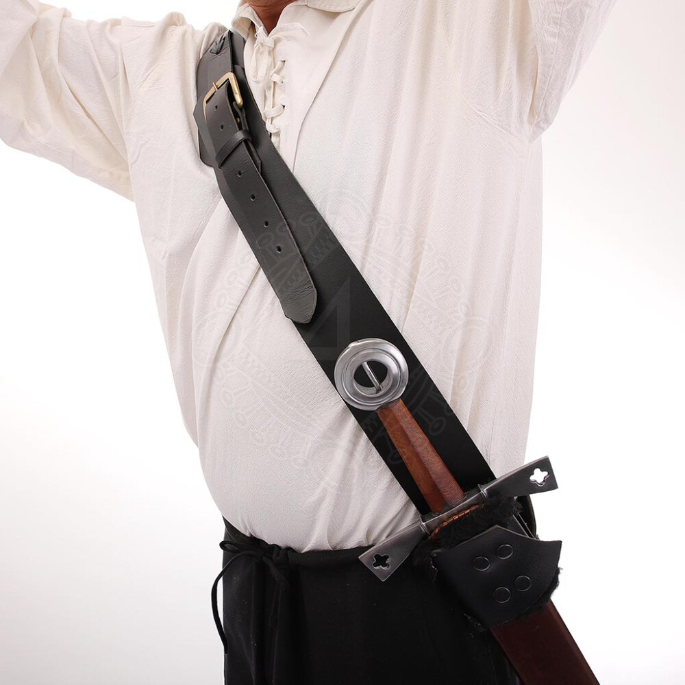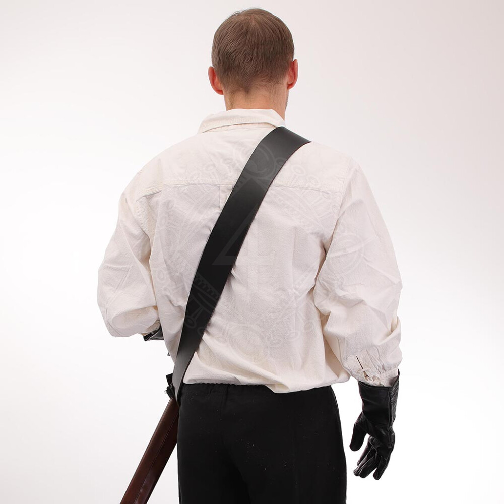 The baldric is crafted from premium, heavy-duty buffalo leather, approximately 3–3.3 mm thick, ensuring exceptional durability and a long lifespan. Unlike thinner imitations, it holds its shape even after years of rigorous use. The wide shoulder strap comfortably distributes the weapon's weight, while a narrower strap with a period-style metal buckle allows for easy length adjustment. The scabbard holder is securely riveted to the main strap.