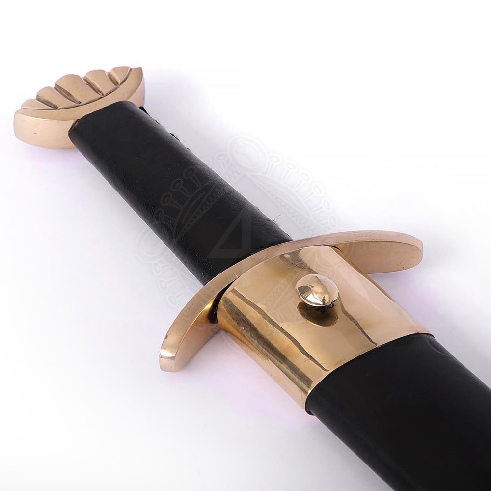 The sword's blade is hand-forged from high-carbon steel and has a polished finish. It is not sharp; the edge has a thickness of approximately 1.7 mm. The hilt consists of a guard and pommel cast from solid brass. The wooden core of the grip is tightly wrapped in black cowhide. As is evident from the photos, the tang of the blade is not peened through the pommel, confirming the decorative nature of the sword.