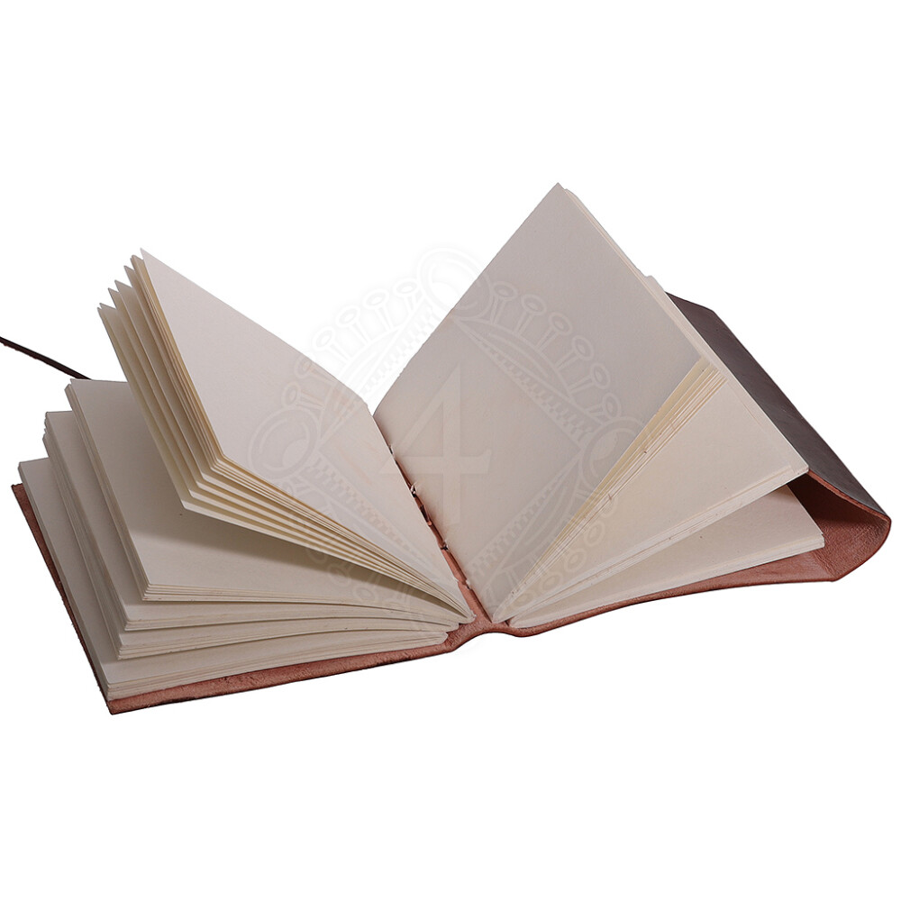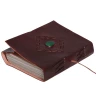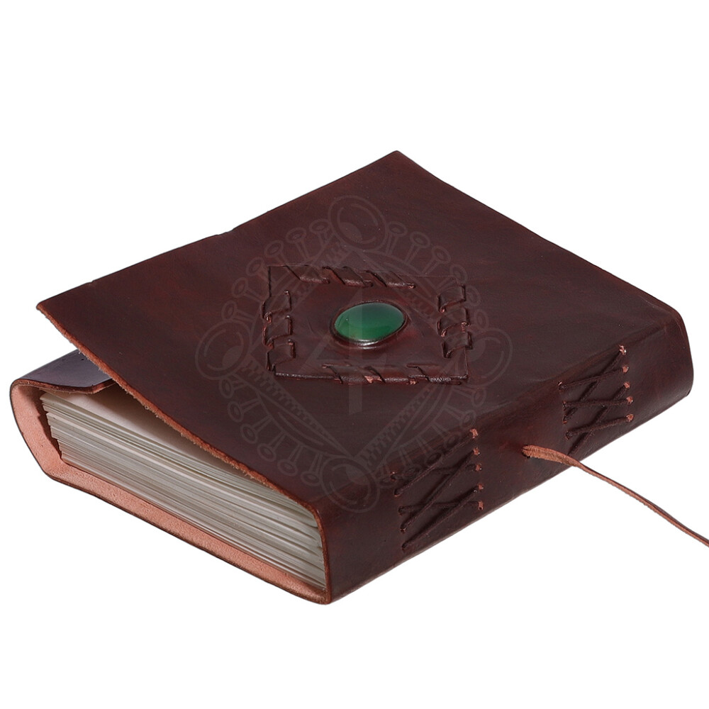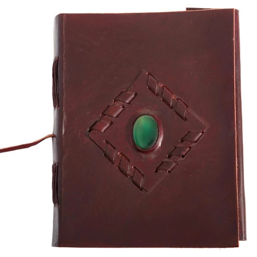 The journal's covers are crafted from thick, quality leather in a pleasant brown colour with a smooth finish. The main feature of the front cover is a centrally placed and carefully sewn-in natural stone.