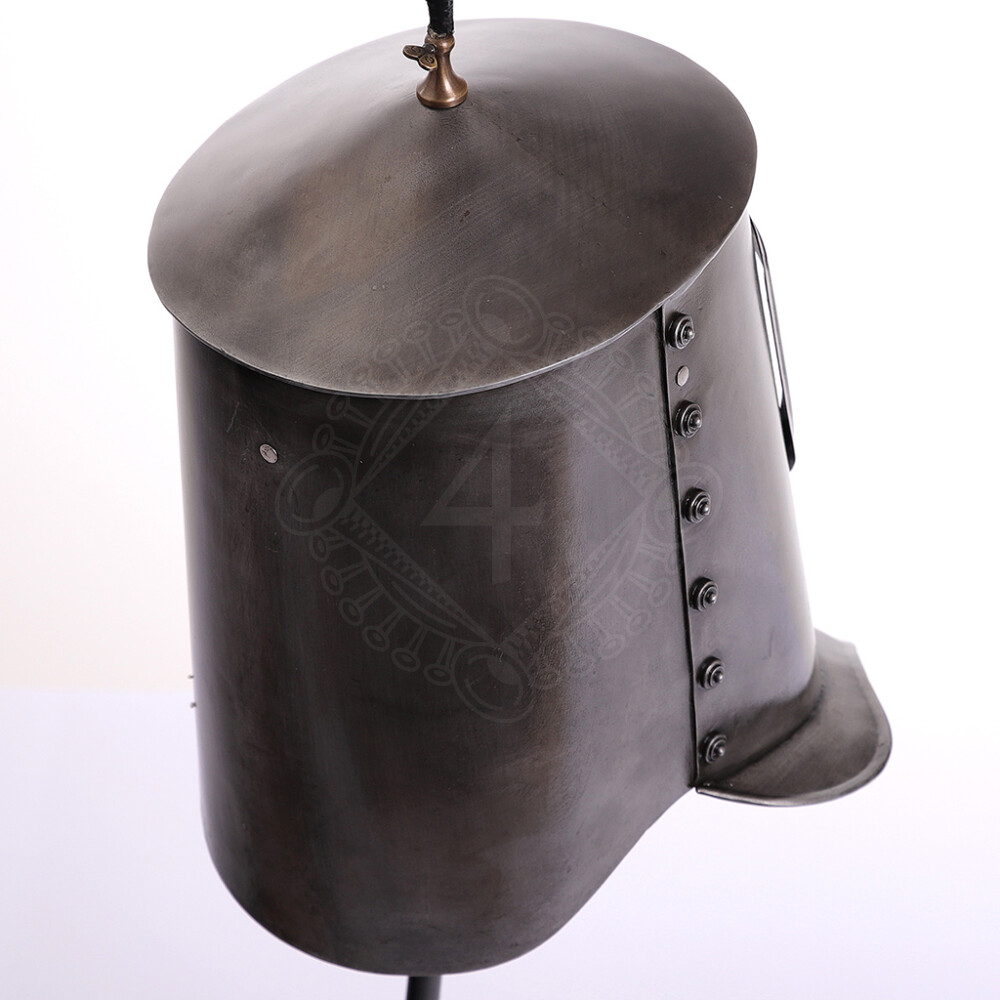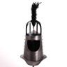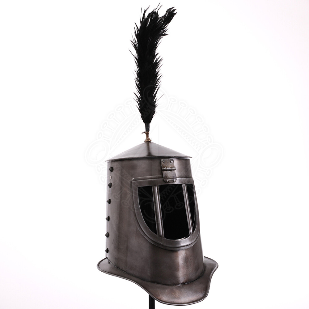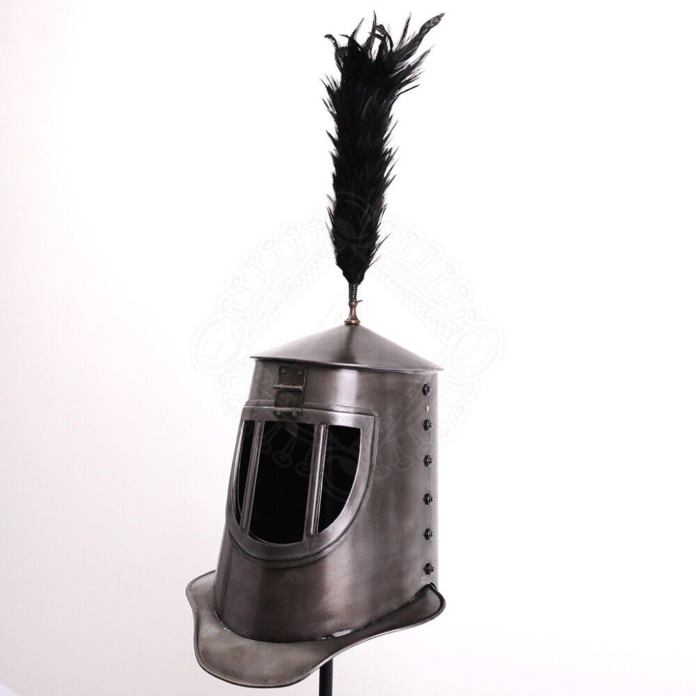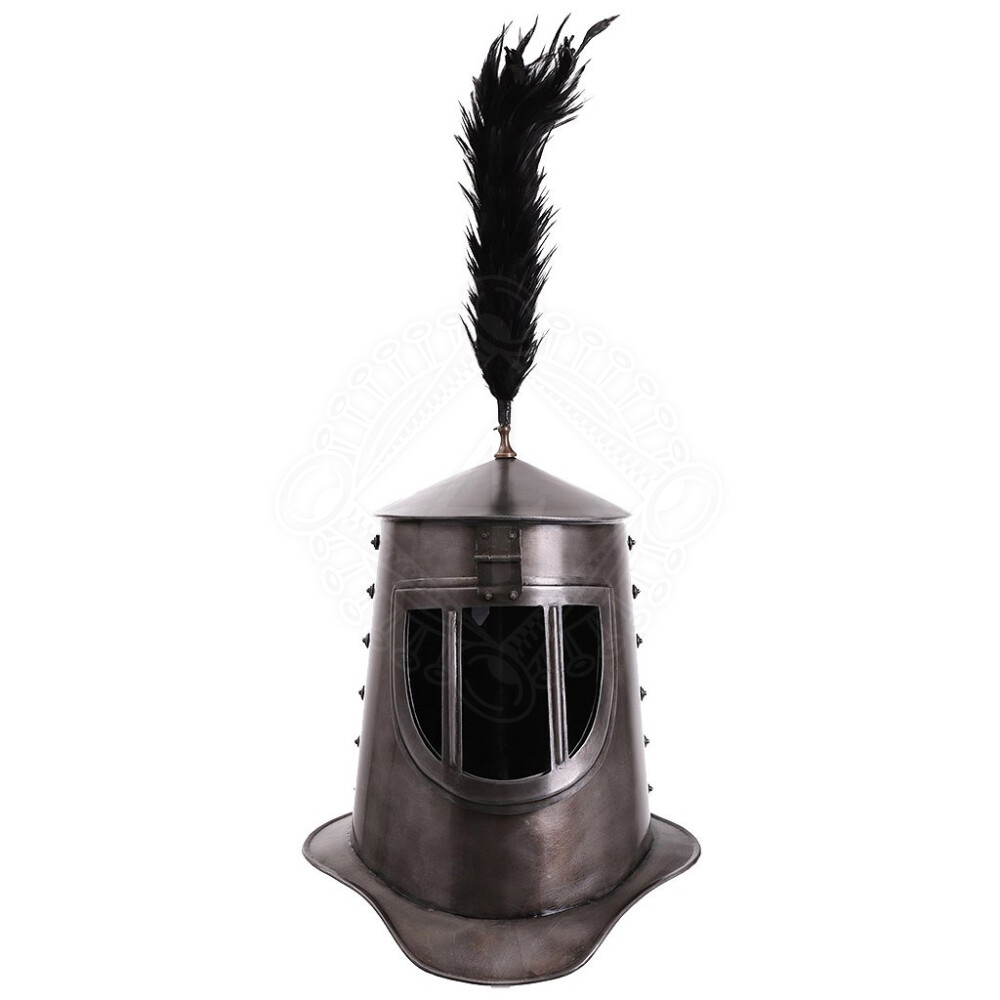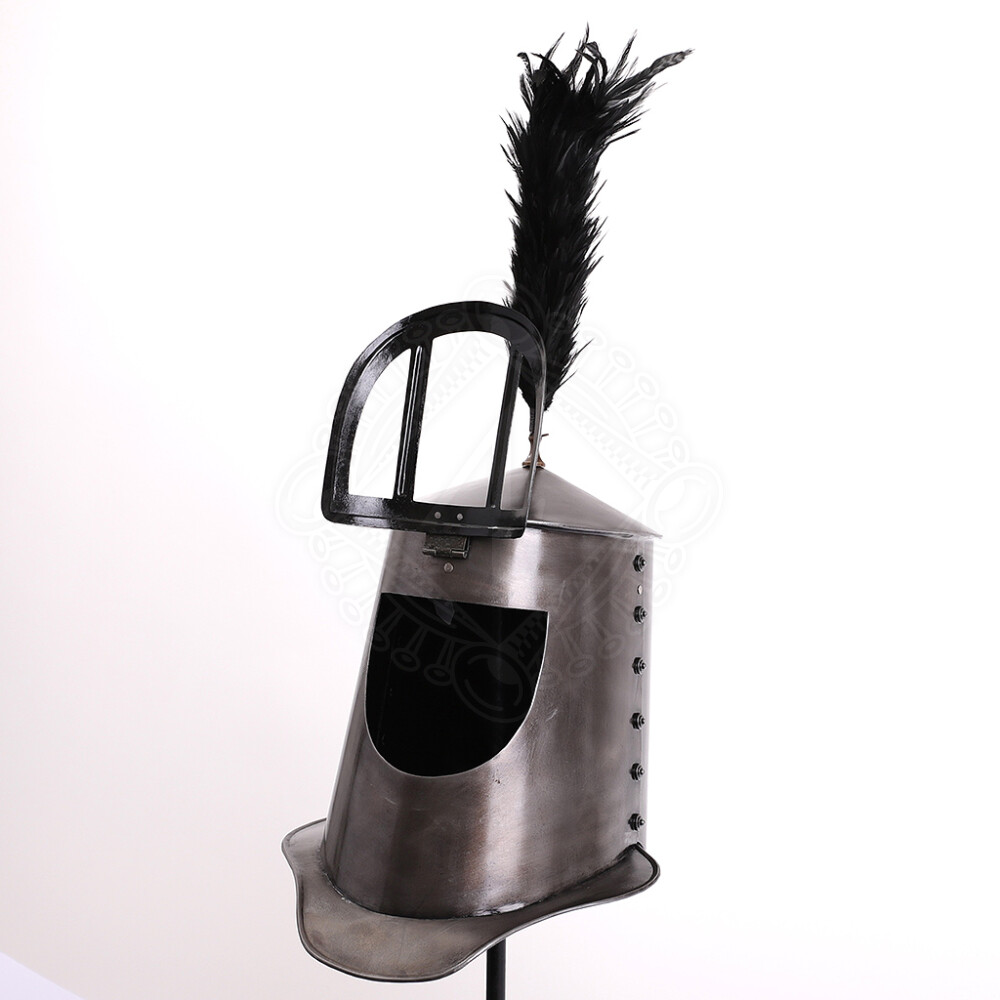 Sir Bedevere Helmet made of a lightweight, soft fiberglass; it has been painted to resemble darkened, blued steel. The front has a moveable visor, while the real brass finial on the top holds a truly silly plume in place. Further product information ...