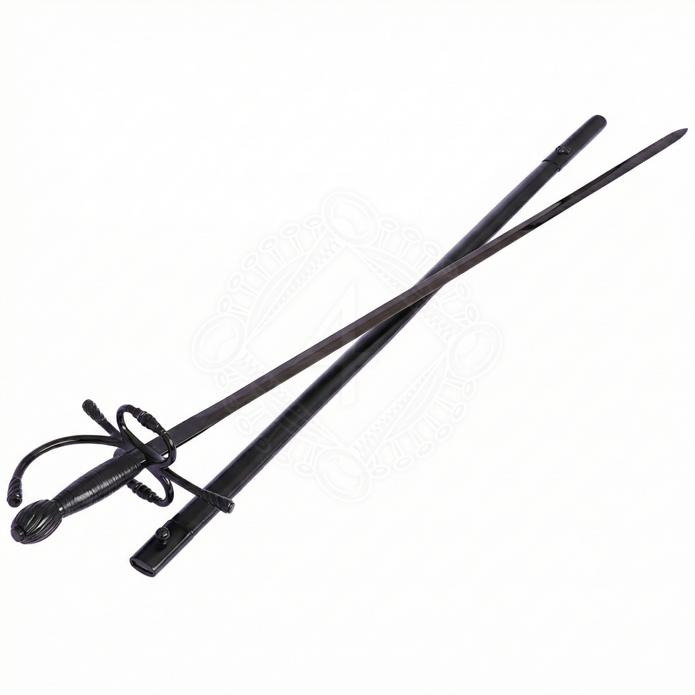 Pitch Black Pirate Rapier with Skull Motif and Scabbard