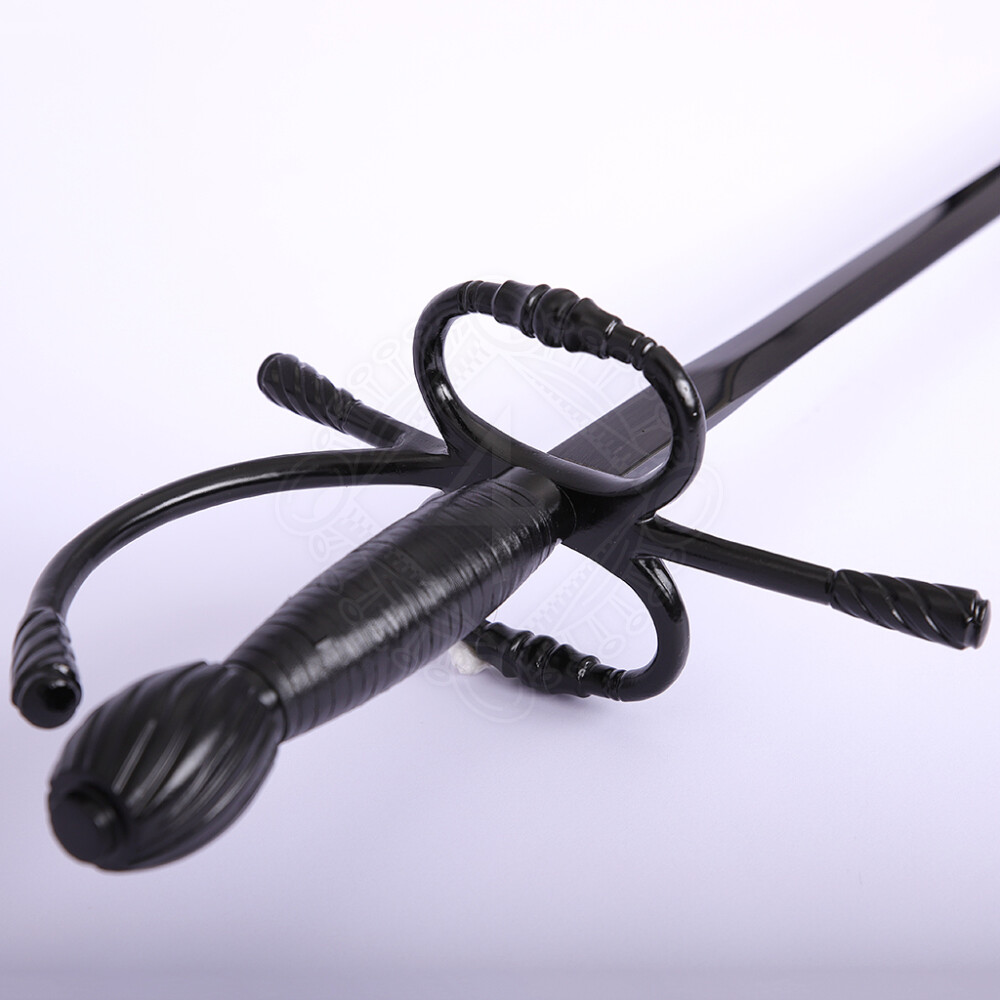 To ensure the rapier serves you long and well while retaining its dark finish, proper care is required. The carbon steel blade is prone to rust, so wipe it dry after every touch or removal from the scabbard and protect it with a thin layer of quality gun oil. Avoid storing the rapier in its scabbard for extended periods, as natural materials can trap airborne moisture and cause the blade to corrode.