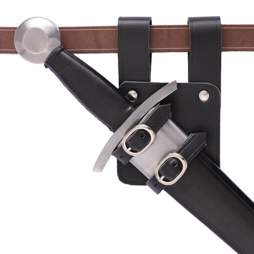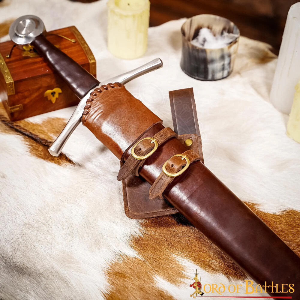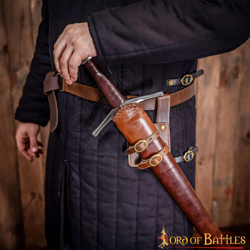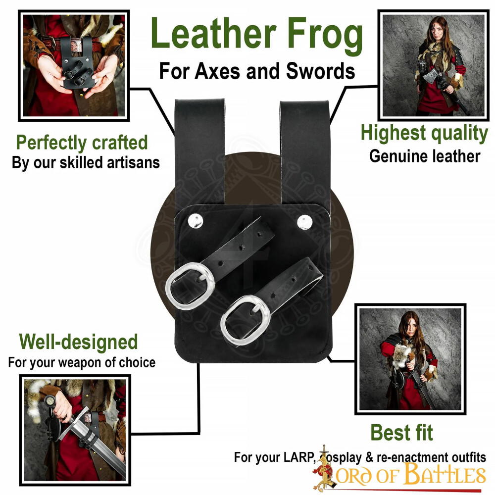 Do you need to keep your axe, dagger, or short sword constantly at hand, but at an angle that won't get in your way while walking or fighting? This handcrafted frog, made from genuine buffalo leather, is the ideal solution. Thanks to its clever system of two adjustable straps, it securely holds a wide range of weapons and tools. Plus, it's available in both right-handed and left-handed versions to suit every warrior. Further product information ...