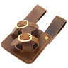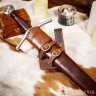 The base consists of a solid backplate made from approximately 3-3.3 mm thick buffalo leather, to which two wide belt loops are securely riveted. The main advantage of this frog is its two adjustable straps, each fitted with an elegant oval buckle made of solid brass. With these, you can firmly and securely grip an axe handle, or the scabbard of a dagger or sword with a diameter of 3 to 5 cm. Your weapon will sit snugly in the holder, preventing unnecessary movement.