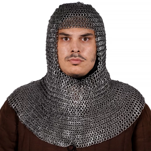 The chainmail coif was the primary piece of head protection for hundreds of years. You can wear it on its own for maximum flexibility, as many foot soldiers did, or as supplementary protection under a helmet—be it a Norman helm, a great helm, or a kettle hat. The coif protects not only the skull but also the neck and shoulders. It is ideal for Historical European Martial Arts (HEMA), reenactments of 12th to 14th-century battles, and for any character that demands reliable and authentic armour.
