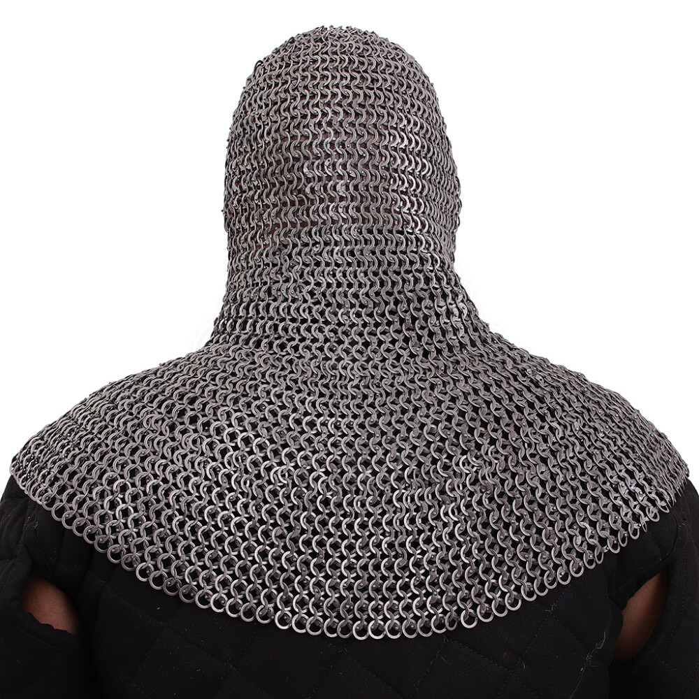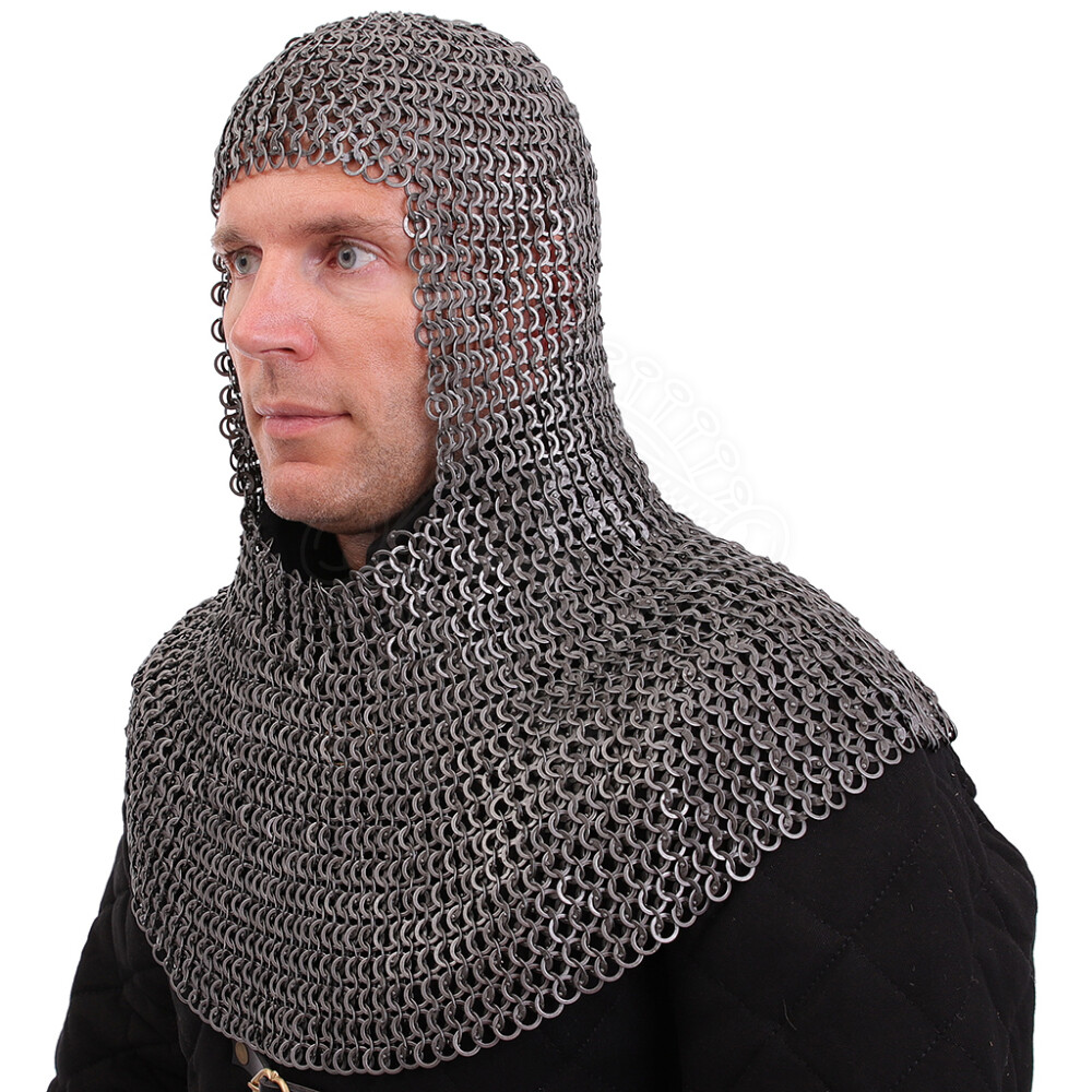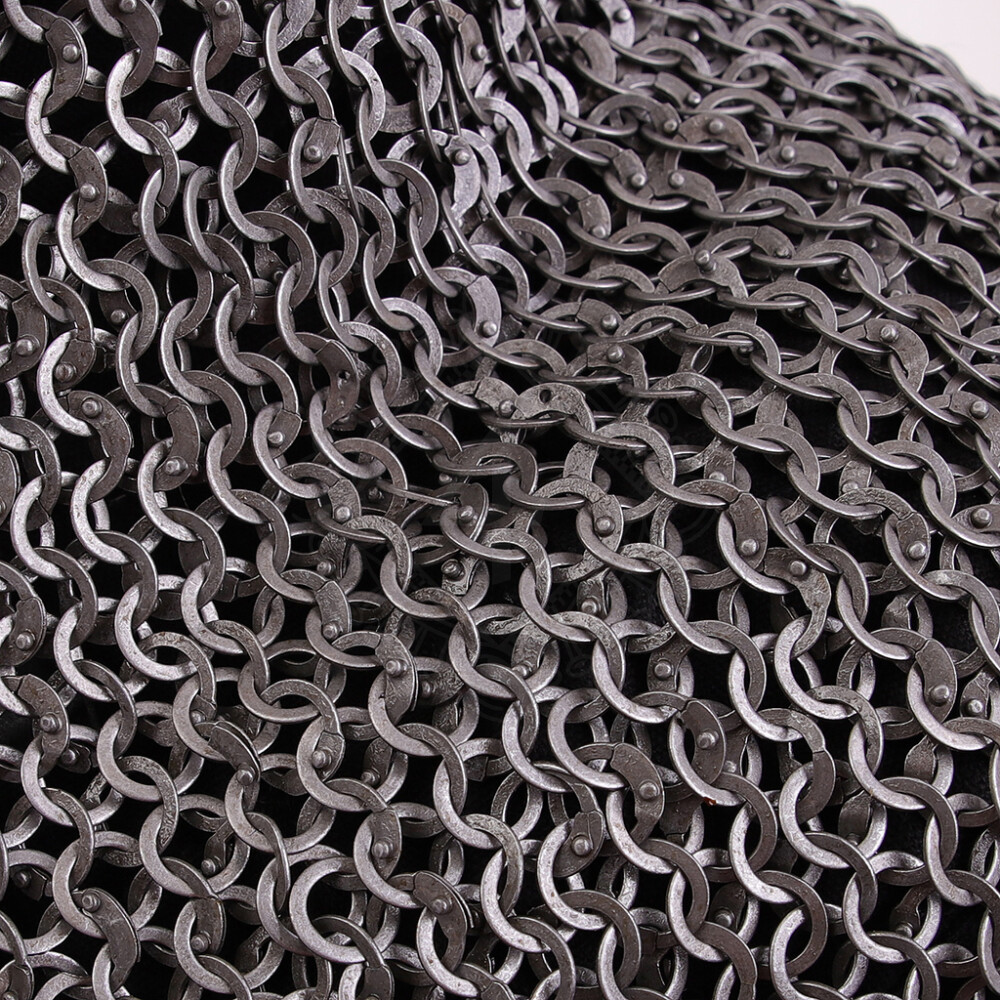 Encase your head in steel and become a Norman, a Crusader, or a knight from the age when chainmail ruled the battlefield. This chainmail coif is crafted with an emphasis on historical accuracy and maximum durability. Its mail is constructed from alternating rows of flat rings fastened with strong dome rivets, and rows of flat solid (punched) rings. This premium construction creates a dense and nearly impenetrable barrier, offering incomparably higher protection than common butted mail. Further product information ...