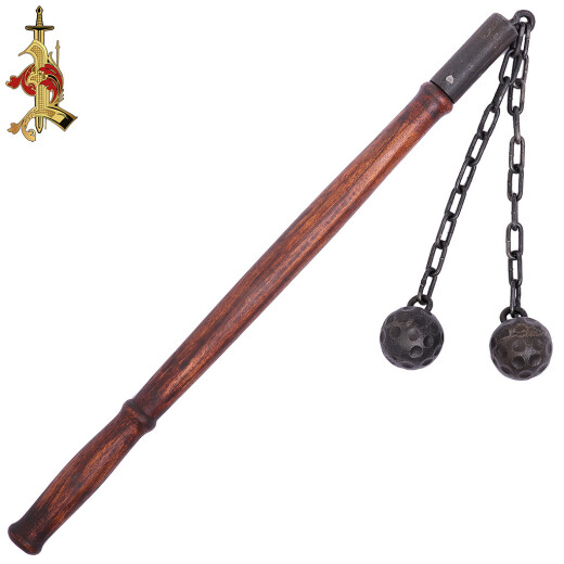 This replica is constructed with an emphasis on historical accuracy and robustness. The haft is crafted from strong and durable ash wood, a material used for centuries in the making of weapon shafts and handles. Its shape is slightly tapered and flared at the end, ensuring a secure and safe grip, even when wearing gauntlets. The top end of the haft is capped with a blackened steel collar, from which two strong, welded chains emerge. Firmly attached to the end of each chain is a heavy ball made of mild steel, designed to deliver maximum impact energy.