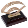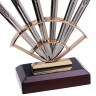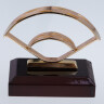 This desktop stand combines classic and modern elements. The foundation is a rectangular base made of dark, lacquered wood with subtly beveled edges, ensuring stability. Mounted on it is a gold-tone metal holder, the design of which is the key feature of the entire product. The holder has a fan-like shape, formed by two concentric arcs. Both arcs have precisely cut slots (6 in total) that securely hold the blades of miniature swords and arrange them in an impressive composition.