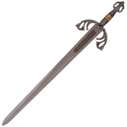 With its complex hilt featuring a protective basket, this replica falls into the category of swords that are forerunners of the rapier. It is a typical example of a Spanish sword known as an "espada ropera" (literally "dress sword"), which served not only as a weapon but also as a fashion accessory for the nobility during the late Middle Ages and the Renaissance.