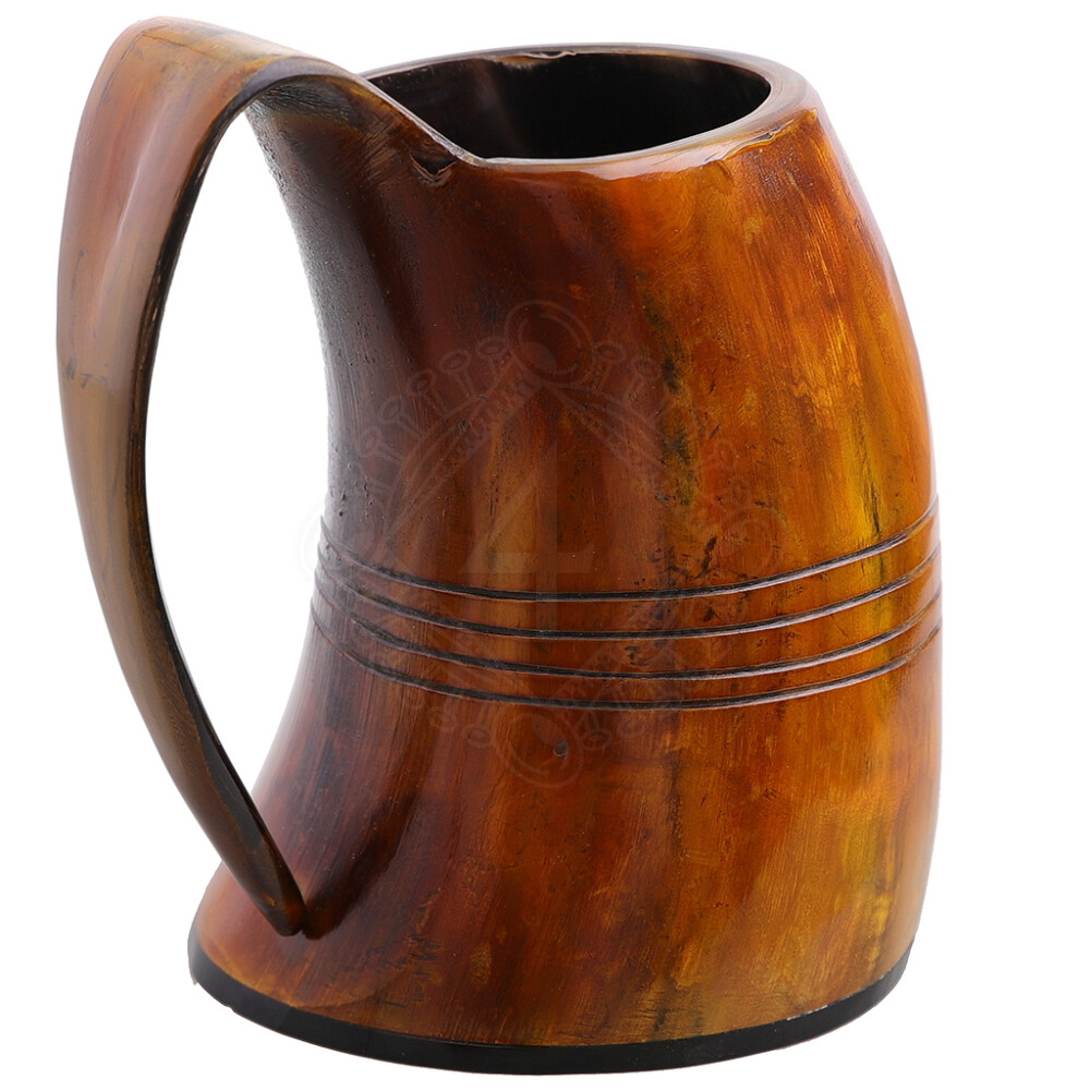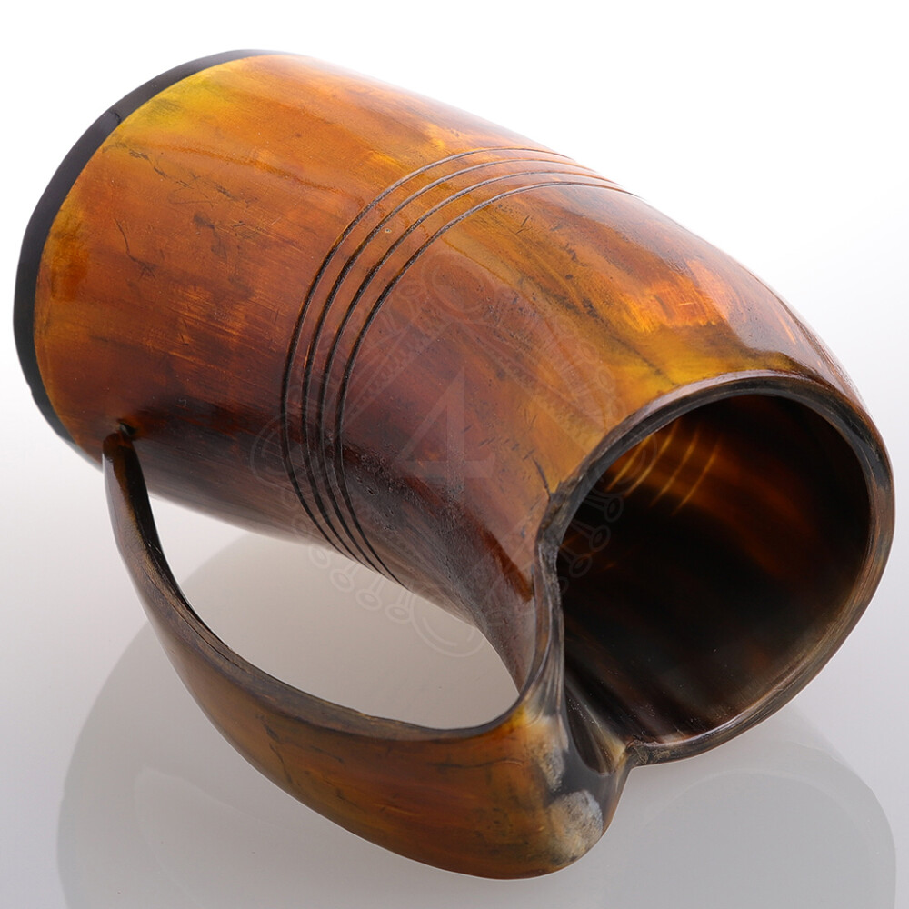 Drinking from horns is an ancient tradition. While classic drinking horns had to be constantly held or placed in stands, the flat-bottomed mug represented a practical evolution. Thanks to its stable base, you can safely set it down on a table without risking spilling your precious drink. This design combines the raw aesthetic of natural horn with the practicality of a modern tankard.
