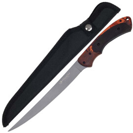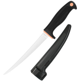 The blade is razor-sharp 420J2 stainless steel for excellent corrosion resistance always important for use in a wet environment. The steel is also quite tough and easy to re-sharpen. What's more, it offers just the right amount of flex to make filleting easier and to preserve the delicate flesh and flavor of the product. The handle is glass-filled nylon for durability and has a rubberized overmold with Kershaw's exclusive K-Texture™ grip. The K-Texture™ pattern ensures you always have a secure hold, even in slippery conditions. For easy storage, the 12-inch Curved Knife with K-Texture™ includes a blade protector.
