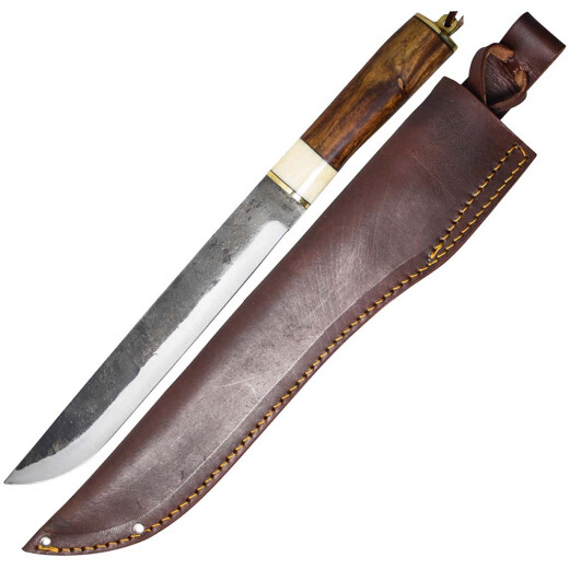 A Sax knife with forged blade made of 1070 carbon steel with a forge stamps on the blade. The handle is made of olive wood, bone and brass. It comes with a leather sheath.