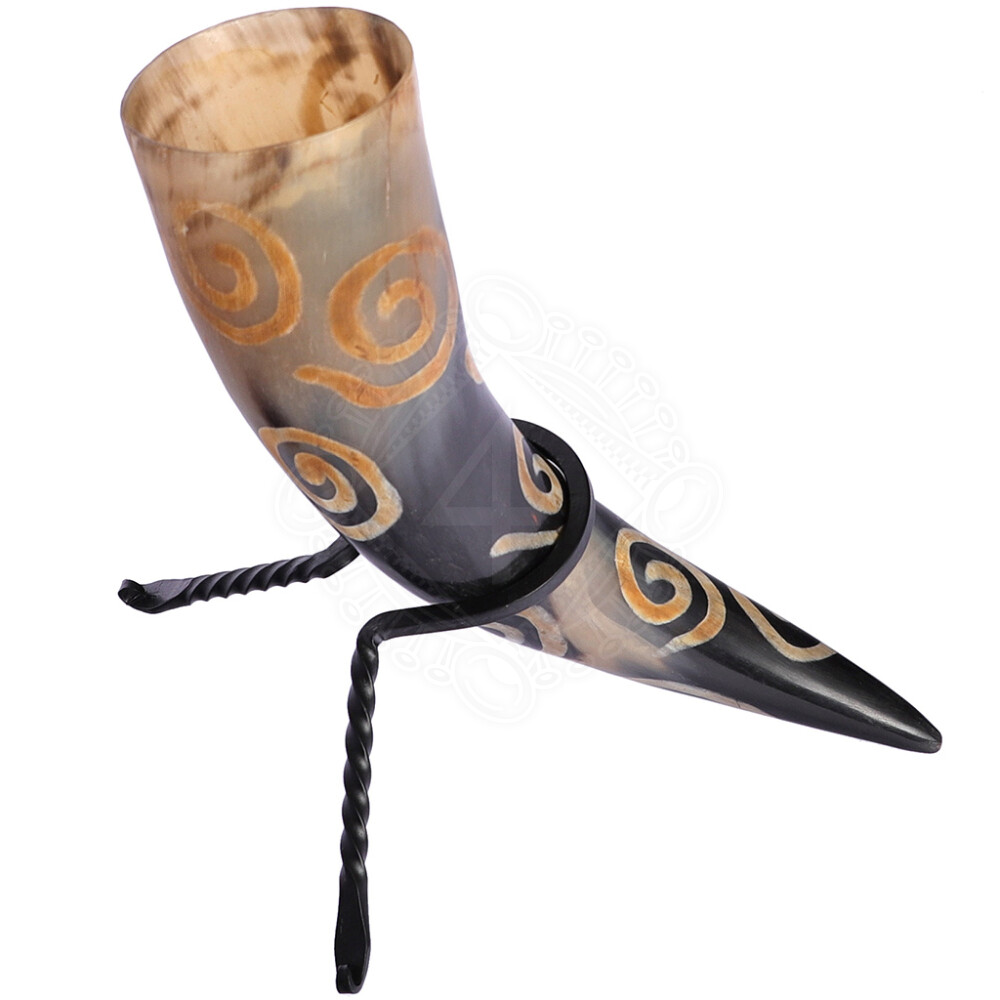 Let old myths and legends come to life with this beautifully decorated drinking horn. Its surface is adorned with hypnotic, hand-carved spirals that give it a touch of mysticism and ancient lore. Whether you are a Celtic warrior, a Viking jarl, or simply a lover of history, this horn will become the pride of your collection and an indispensable companion at feasts. Thanks to the practical iron stand included in the package, it will also serve as an elegant decoration for your table when you're not drinking from it. Further product information ...