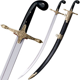 Inspired by highly decorative antique Persian blades, Cold Steel®'s Scimitar is a true Eastern jewel! Its handsome blade is deeply curved to facilitate the devastating draw cut, and beautifully polished with a wide, deep fuller. Made from expertly heat-treated 1065 high carbon steel, it is perfectly balanced and hand-honed to a keen edge. The large S-guard and tang are intricately engraved and the dark Malaysian sal wood handle scales are securely held in place with three sturdy brass pins. The bulbous pommel features a brass inlaid hole for a cord, lanyard or sash. Further product information ...