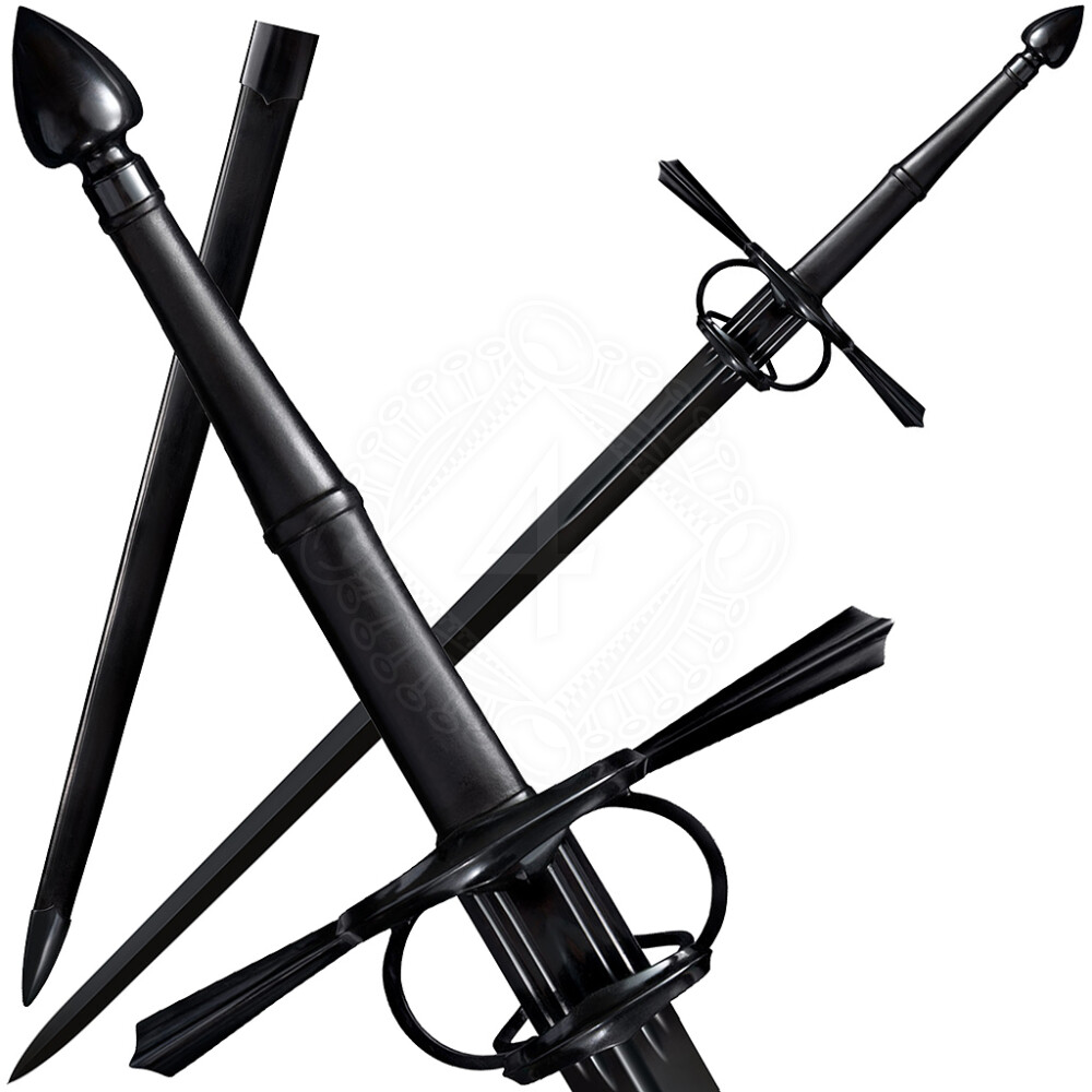 At first glance, its all-black finish, a hallmark of the Man at Arms series, is captivating. The long, double-edged blade made of 1050 high carbon steel is precisely sharpened and ready for use. It measures an impressive 953mm (approx. 37.5 inches) and has a blade thickness of 6.35mm (approx. 0.25 inches). The 368mm (approx. 14.5 inches) long grip allows for a comfortable and secure two-handed hold. The hilt is dominated by intricately designed guard rings and side-rings, along with a crossguard with pointed ends. The enclosed ricasso (the unsharpened part of the blade near the guard) allows you to safely loop a finger over the crossguard for enhanced control during fencing. The heavy pommel not only perfectly counterbalances the long blade but can also serve as an effective striking weapon in its own right. The sword's overall length is 1320mm (approx. 52 inches) with a weight of 2225g (approx. 4 lbs 14 oz). You'll also receive a robust scabbard made of strong leather and steel, also in black, perfectly matching the sword.