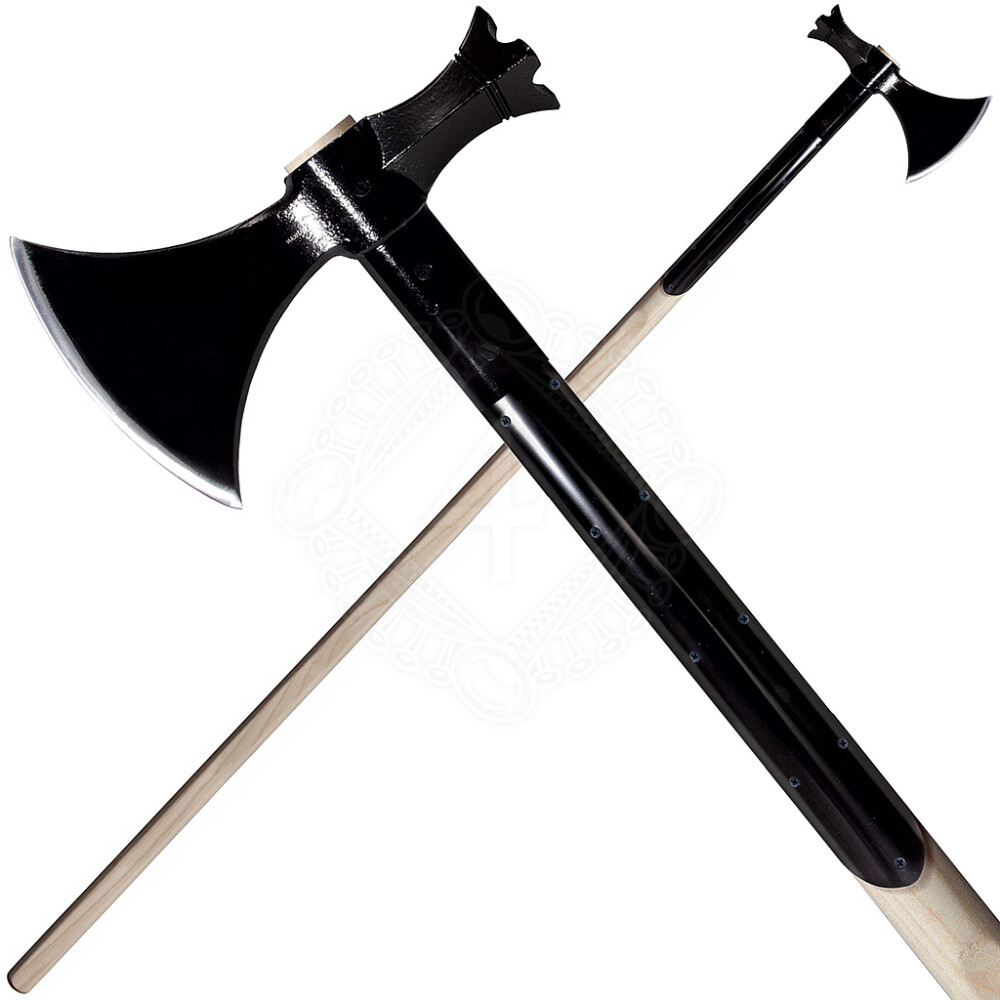 Cold Steel®'s pole axe is expertly drop-forged from 1055 high carbon steel. The extremely sharp axe blade and tough hammer head are differentially heat-treated, leaving the ends of the weapon hard and the body a little softer to absorb shock and impact. The tough American ash handle is further strengthened with black steel langettes. Further product information ...