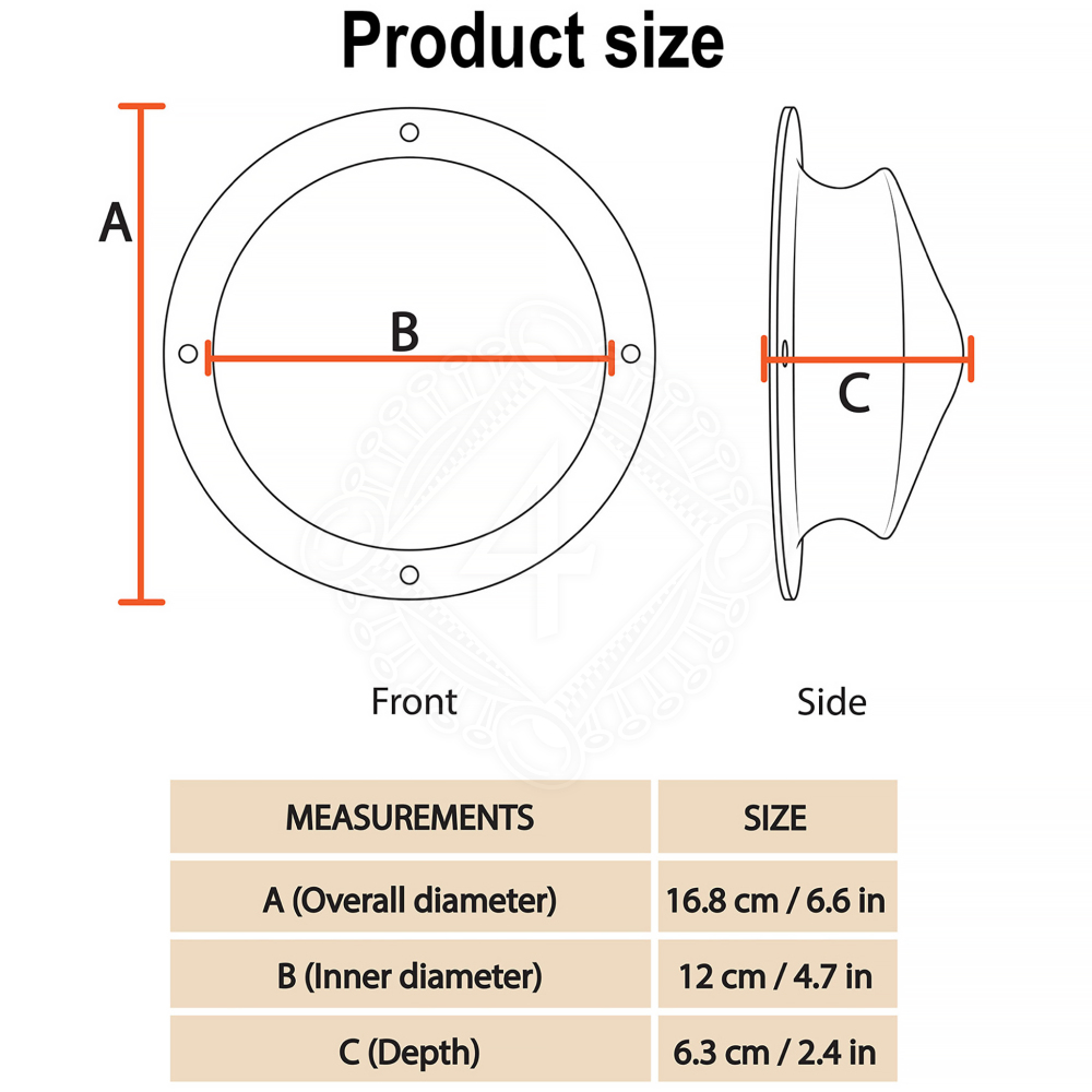 The boss is crafted from 1.5 mm (16 gauge) thick mild steel, giving it solid durability. It features a conical shape with a slightly rounded tip, designed to effectively deflect blows and protect the hand gripping the shield. The flat flange is equipped with four pre-drilled holes for easy and secure riveting to your shield board. The mirror-polished surface of the boss creates a stunning contrast against wood or painted shield motifs, lending you the appearance of a wealthy and seasoned warrior.