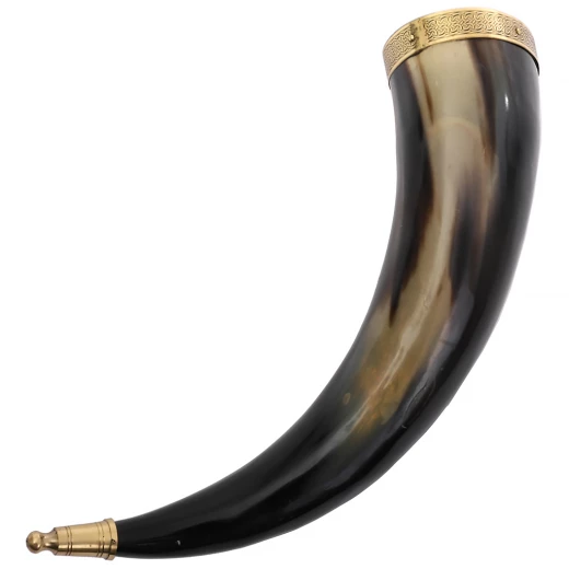 This Viking horn is a perfect example of the fusion of natural material and skilled craftsmanship. Its surface is perfectly polished, revealing the unique grain of the horn. The upper part boasts a natural marbling in translucent shades of beige, grey, and brown, which flows seamlessly into a deep black tip. The rim of the horn is fitted with a wide brass band, exquisitely engraved with a continuous, endless Celtic knot design. The horn's tip is finished with a simple yet elegant brass finial with a rounded end.
