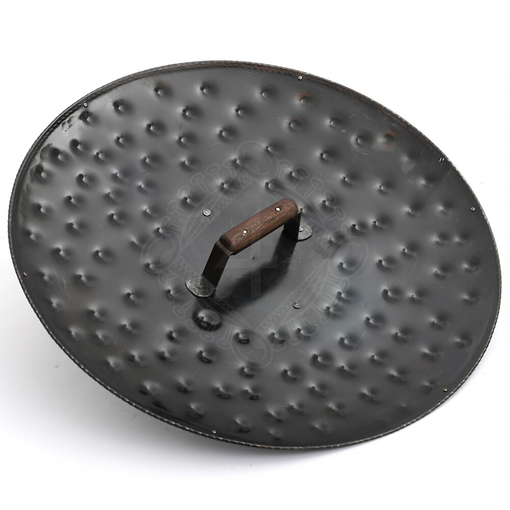 This steel shield is crafted from 1.6 mm thick mild steel, giving it substantial durability and a realistic weight. The first thing you'll notice is the distinctive dimpled texture, created by hundreds of hammer blows, which not only looks fantastic but also helps to deflect cuts and thrusts. The entire surface is blackened, giving it a dark, authentic look and protecting it from corrosion.