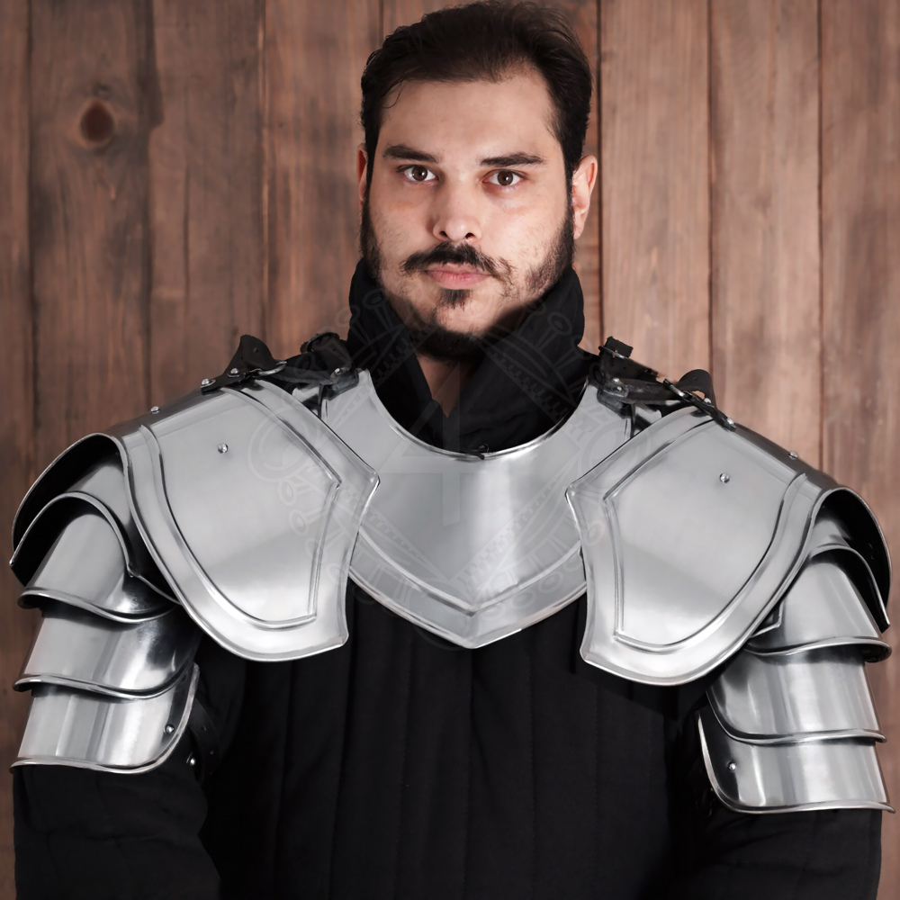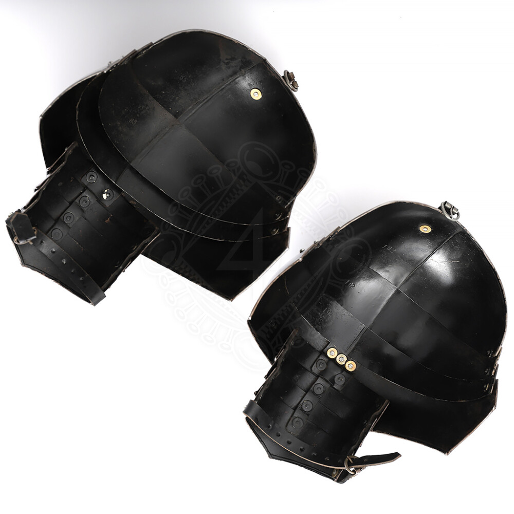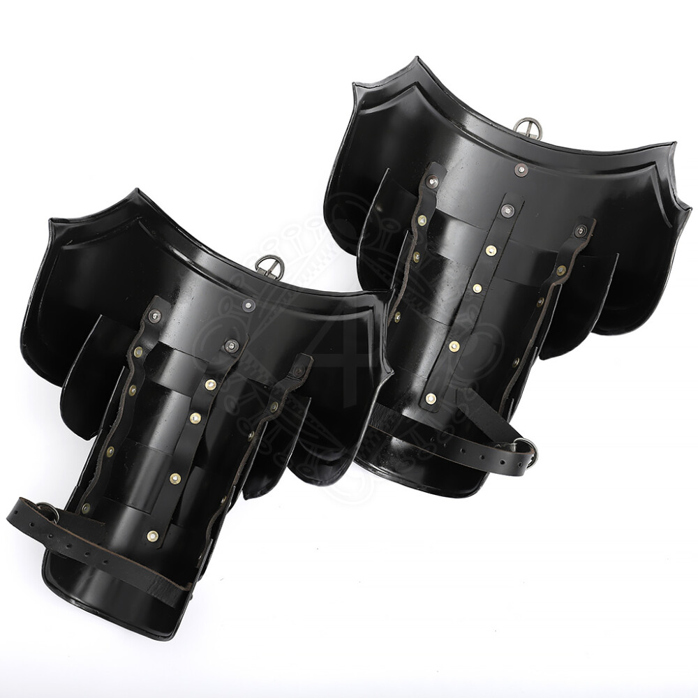 These shoulder plates are designed with practicality and style in mind. They consist of several articulated plates (lames) that allow for excellent flexibility and freedom of movement. The top, largest plate covers the shoulder joint, while the subsequent smaller plates protect the upper arm. The blackened finish not only looks menacing and elegant but also provides basic protection against corrosion.