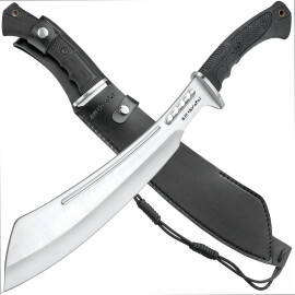 Made of state-of-the-art TPR, the handle is rugged and waterproof, with ergonomic contours and texture for a slip-free grip. The tactical kukri is 19 5/8” in overall length and comes housed in a premium, reinforced genuine leather belt sheath.