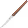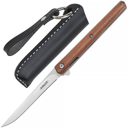 An elegant and slim pocket knife. The blade is made of 440 stainless steel and is locked with a liner lock. The handle covers are made of sandalwood. The delivery of the knife includes a leather case with a hanging strap. Further product information ...