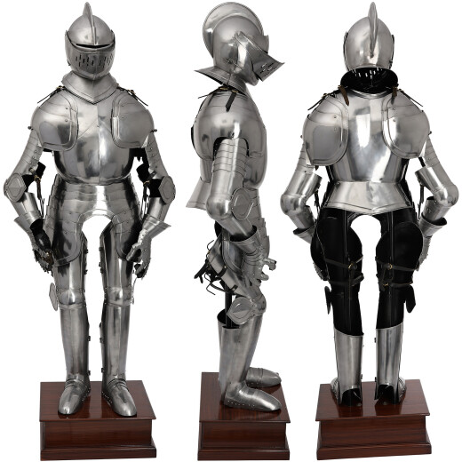 This full suit of armour is inspired by the armour of Charles the Bold, the last Duke of Burgundy. It is an example of full plate armour that was available to well-off warriors in the late 15th century. Although this armour is only designed as decoration, it is fully articulated. It would fit a person about 180cm tall. Its plates are made of 1.2 mm thick mild steel (not stainless!). Further product information ...