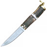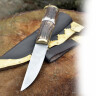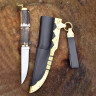 Beautiful and handy Viking utility knife with a sharpened blade forged out of high carbon steel and a hilt made of genuine staghorn. Its shape resembles the type of knives which are still widely spread in Scandinavia nowadays and are known as Sami knives. Delivery includes a sturdy leather scabbard ornamented with the kind of brass fittings which were characteristic of the early medieval Germanic knives. The knife's pommel also features a brass ring. The staghorn hilt is made from naturally grown antlers. Differences in color and shape are thus inevitable but also make each knife a unique piece. Further product information ...
