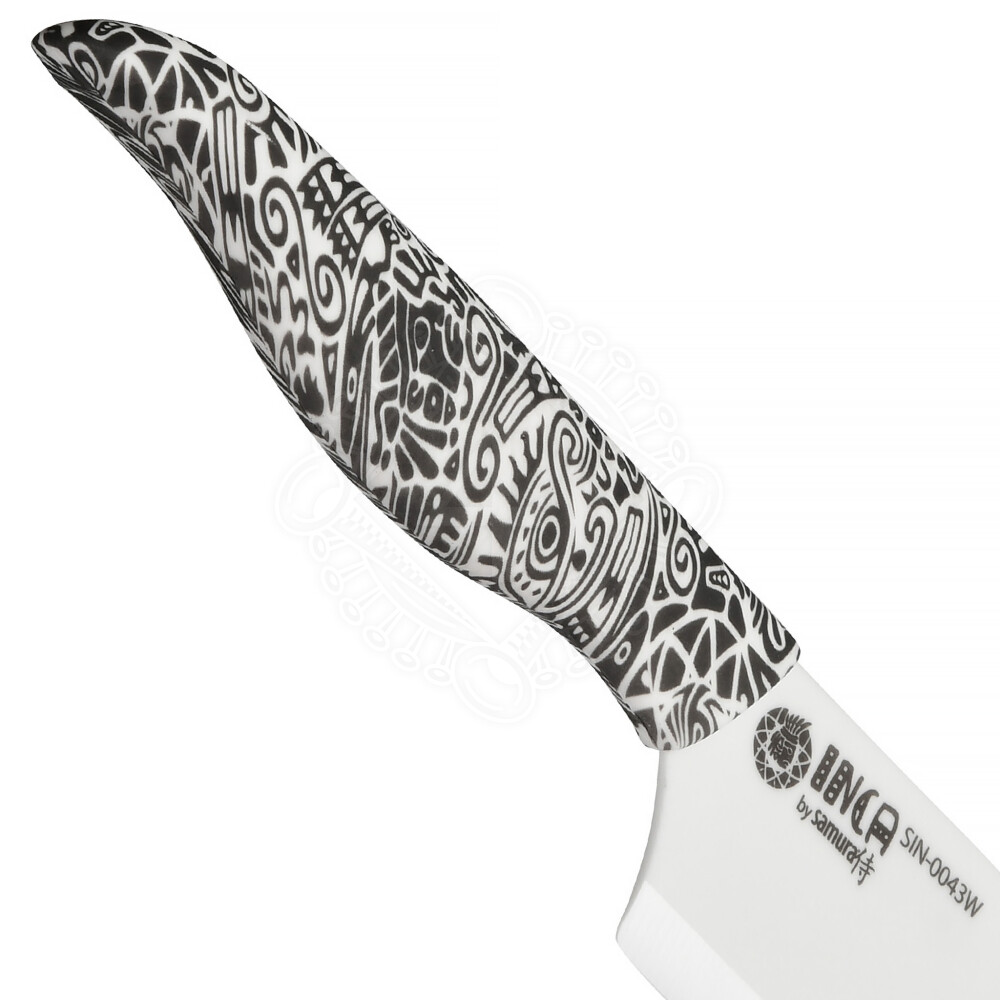 The INCA collection is a tribute to an ancient civilization of Incas. Following an ancient tradition, we use only the best progressive raw materials – snow-white Zirconium Dioxide, sintered at 2000 degrees Celsius for 48 hours, making a monocrystal structure as hard as diamond. The handle is made of ABS plastic, which is covered with TPR, creating a pleasant soft touch; its pattern represents a compilation of traditional decoration motifs of the Incas. Further product information ...