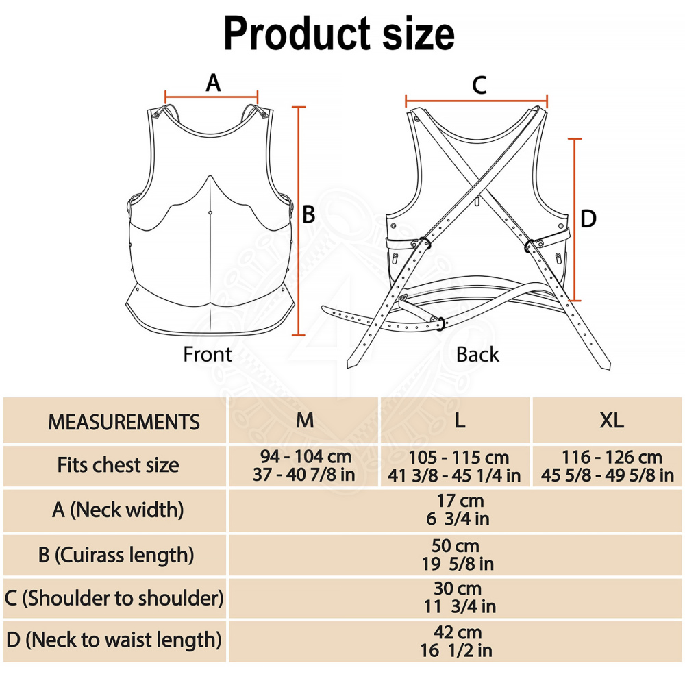 IMPORTANT NOTICE: This breastplate is a robust replica, but it is not certified as personal protective equipment. It is not intended for full-contact combat sports like HMB, buhurt, or the Battle of the Nations.