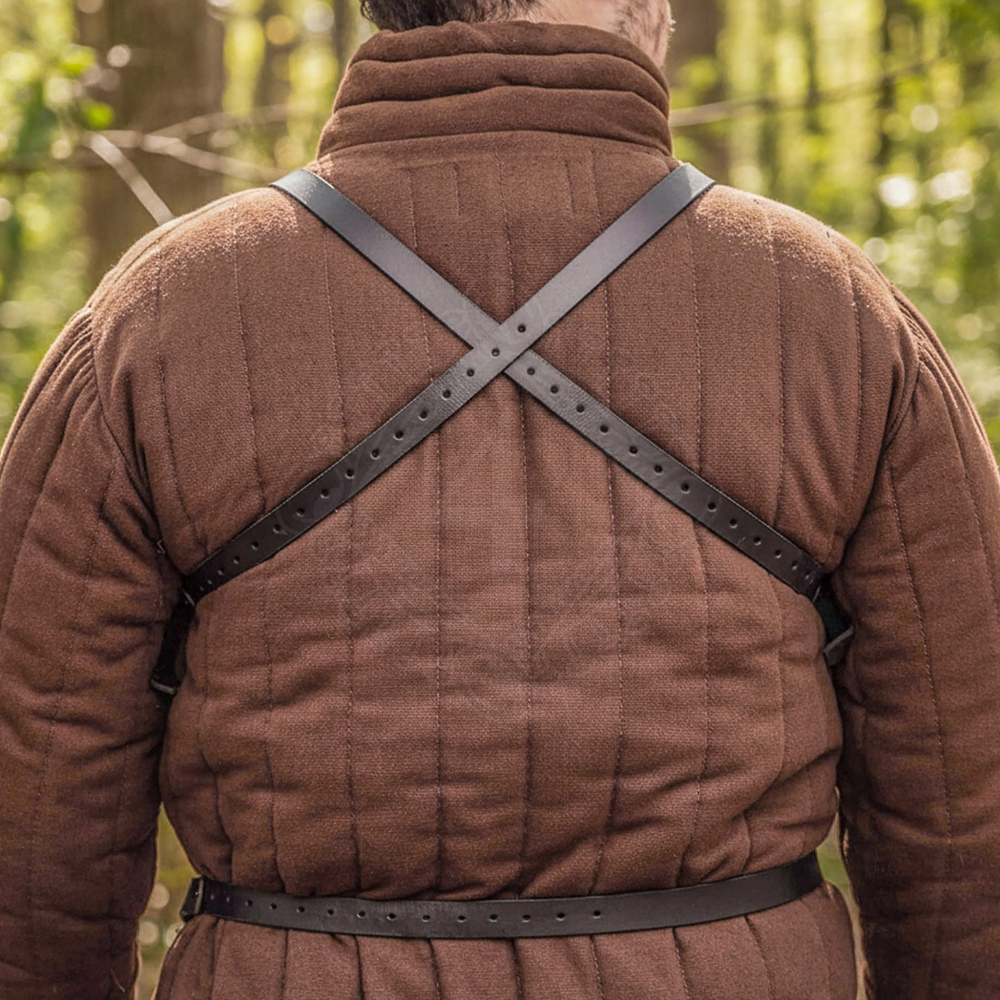 • Strapping System: The breastplate is secured with robust, crisscrossed straps of genuine leather on the back. Adjustable steel buckles allow you to achieve a perfect fit over your gambeson.