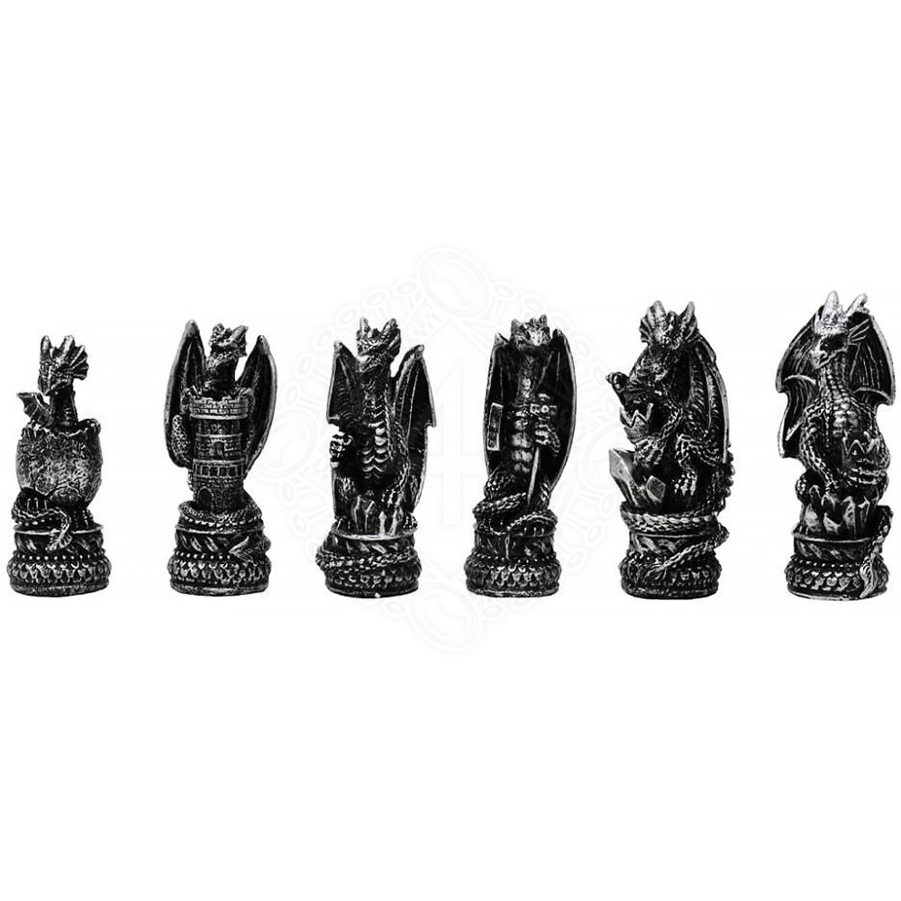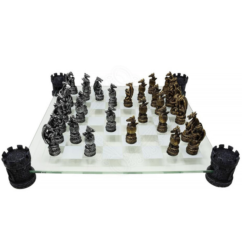 Chess pieces Dragons, gold and silver pieces with glass chess board